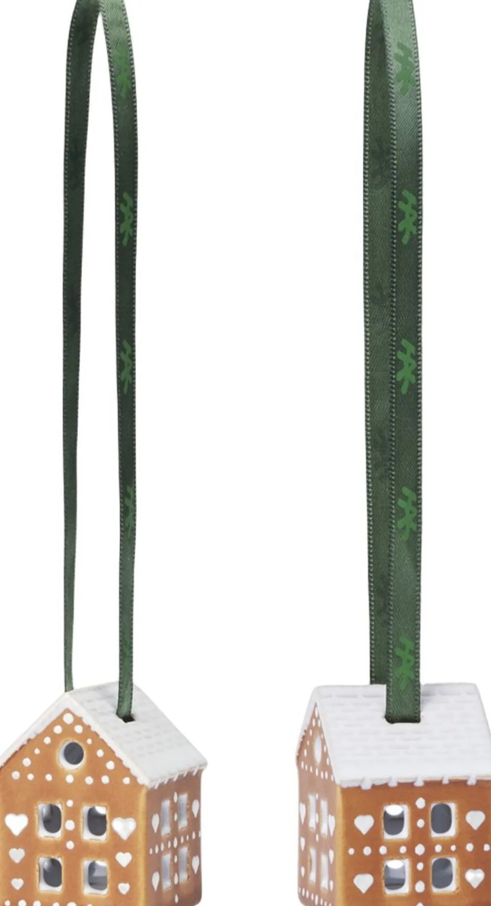En smagfuld juleklassiker i håndlavet keramik formet af tradition. Kähler Gingerbread er en serie af moderne honningkagehuse og ophæng fra Kähler, hvor kombinationen af et charmerende udtryk og håndlavede designtraditioner møder varmen fra fyrfadslysene og de klassiske juletraditioner, der skaber både stil og hygge. Bagværk hører julen til, og med sit naturtro udtryk er det det let at forestille sig, at Kähler netop har taget et nybagt honningkagehus ud af keramikovnen. Ja, du kan næsten dufte honningkagen, men tag ikke fejl hele Gingerbread-serien er skabt i stentøj, og den hvide glasur er keramisk. De små Kähler Gingerbread-juleophæng måler 5 cm i højden og er dekoreret med sirlige mønstre med de sødeste små hjerter og sne på taget, som man ville dekorere et honningkagehus. Lad dem pynte på grene, i vinduet eller på juletræet og nyd dem gennem hele december sammen med resten af serien. I toppen af Gingerbread-juleophængene er der to små huller i taget, hvori der er montereret elegante bånd i Kählers velkendte grønne farve. De påtrykte HAK-initialer skaber en taktil og levende ophængning, der omfavner Kähler-historien og står i smuk kontrast til det varme og brune farve på stentøjet. Gingerbread-juleophængene sælges parvis og skal selvfølgelig gemmes i generationer og tages frem år efter år som en smuk og hyggelig tilføjelse til julepynten i familien. Mette Bache og Barbara Bendix Becker er designerne bag Kähler Gingerbread, og deres formgivning er kendetegnet ved mødet mellem det stringente og det autentiske. Lyshusenes geometriske flader blødes op af de sirlige dekorationer og de mange vinduer og døre, der alle stor som lille er udskåret i hånden, så lyshusene får et naturligt og hyggeligt udtryk. Og på samme måde er juleophængene enkle og grafiske, men fulde af liv og autenticitet i kraft af dekorationerne og det håndlavede udtryk.