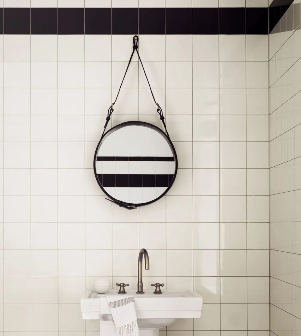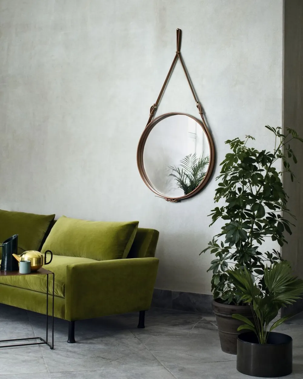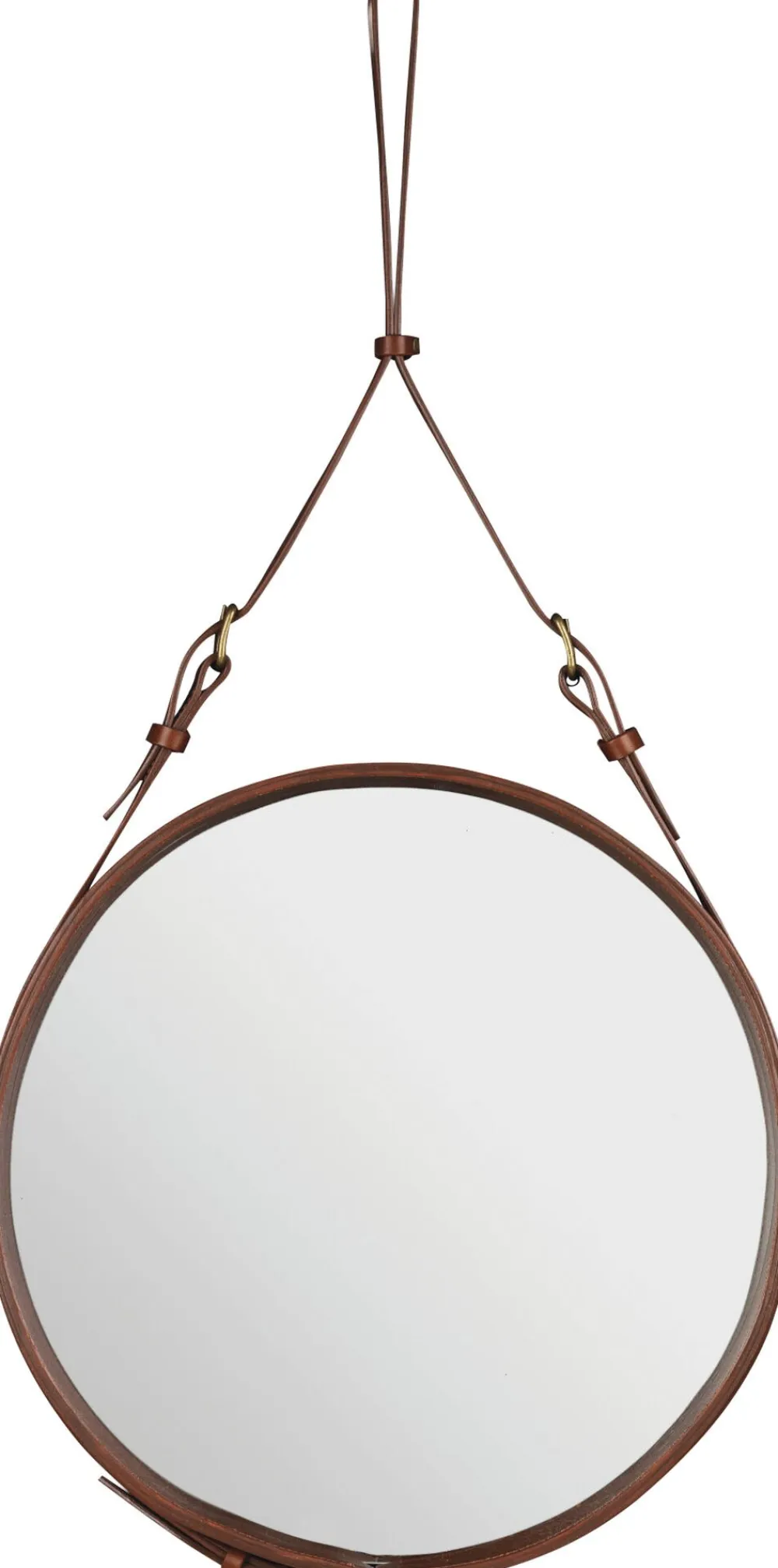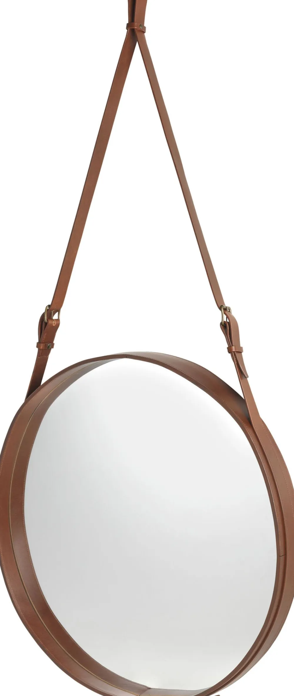 Art Deco er en eklektisk kunst og design stil, der begyndte i Paris i 1920’erne og blomstrede op internationalt gennem 1930’erne ind i 2. Verdenskrigs æra. Jacques Adnet er møbeldesigner og er bedst kendt for sit Art Deco modernistiske design, og et ikon af fransk modernisme. Adnet er kendt for sine avantgarde design, og var en af de første til at integrere metal og glas i strukturen og udsmykningen af møbler. Hans stil er indbegrebet af luksus. I 1950 dannede Adnet et partnerskab med det franske modehus, Hermes, hvor han udviklede en samling af læderbetrukne møbler og boligtilbehør. Derfor lavede han det runde læder spejl med messing hængsler. Udover de bemærkelsesværdige læder og messing detaljer er spejlet også enestående, da remmen, der holder spejlet, er den direkte dimension direkte i forhold til spejlet.