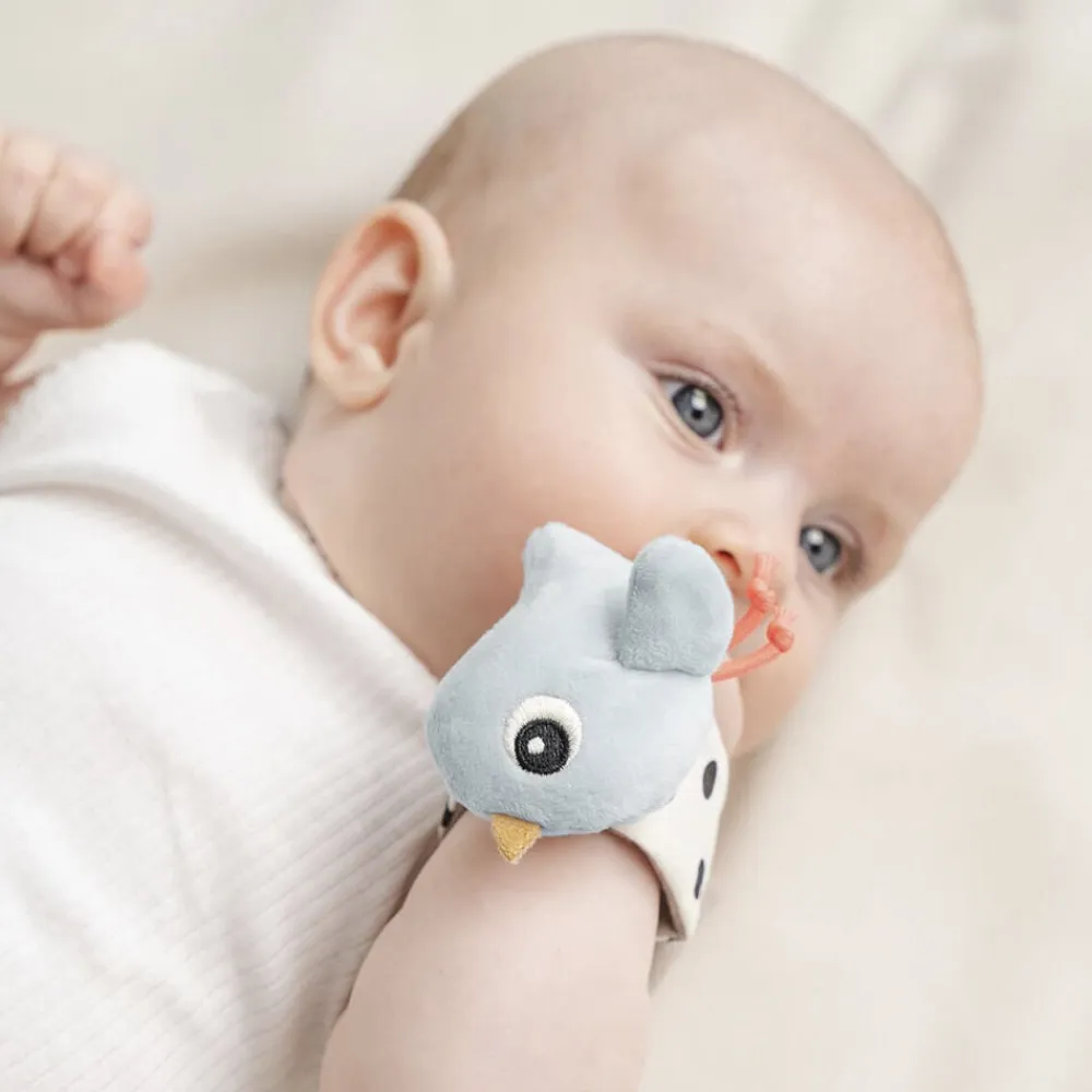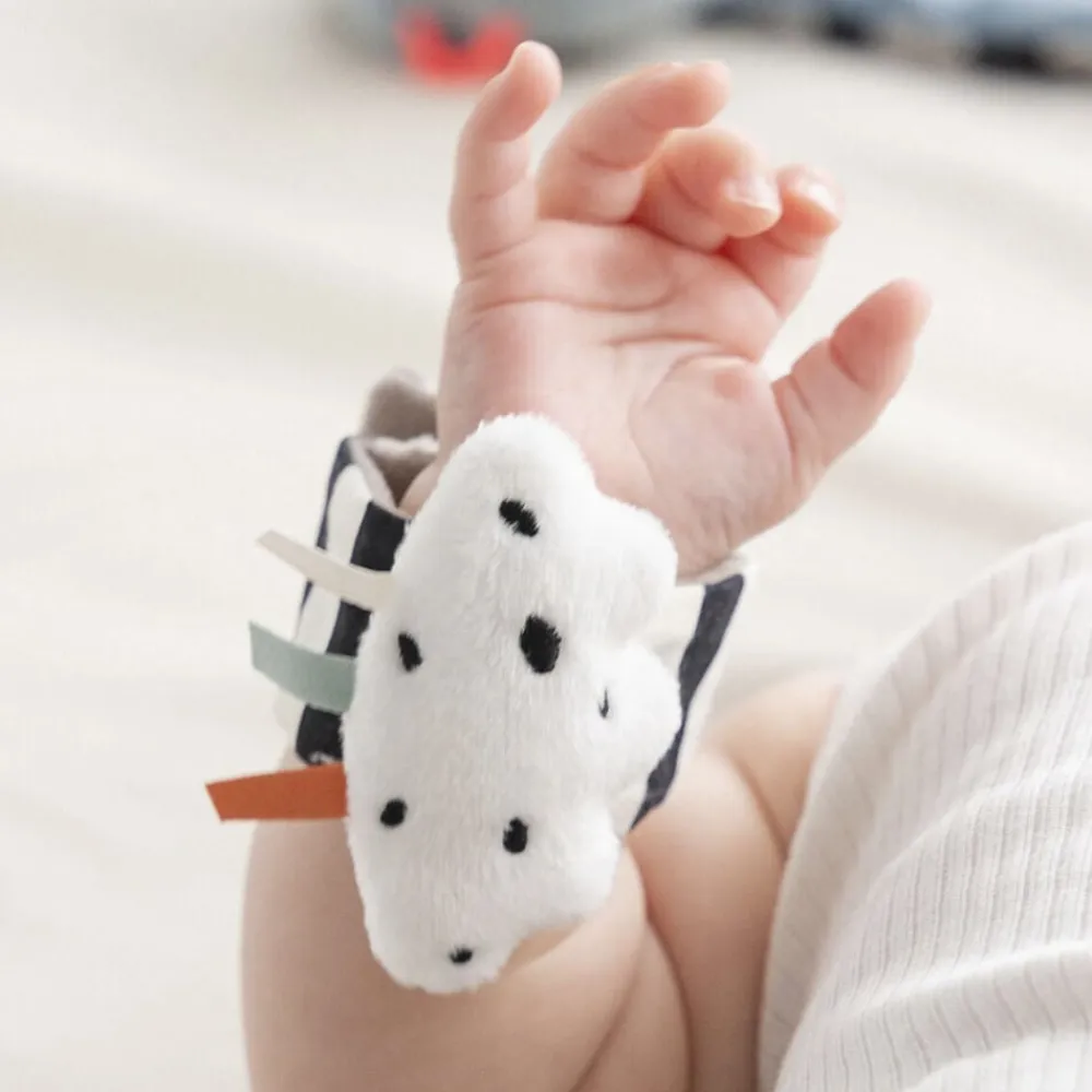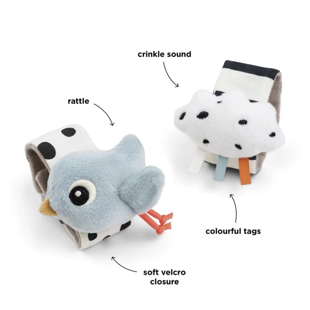 Happy clouds håndledsrangler består af 2 bløde babyarmbånd med blå detaljer