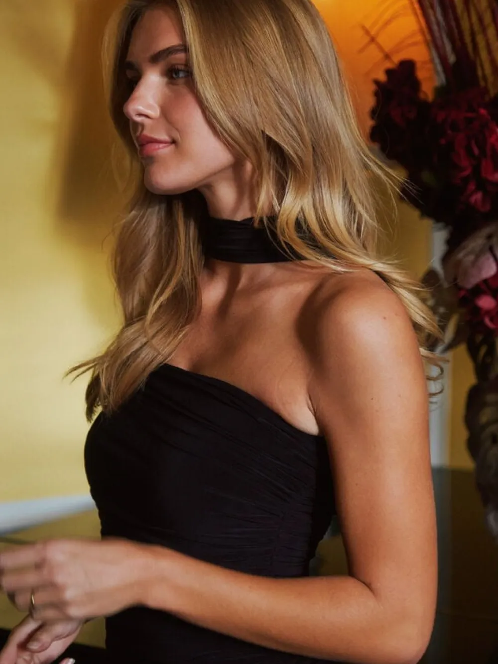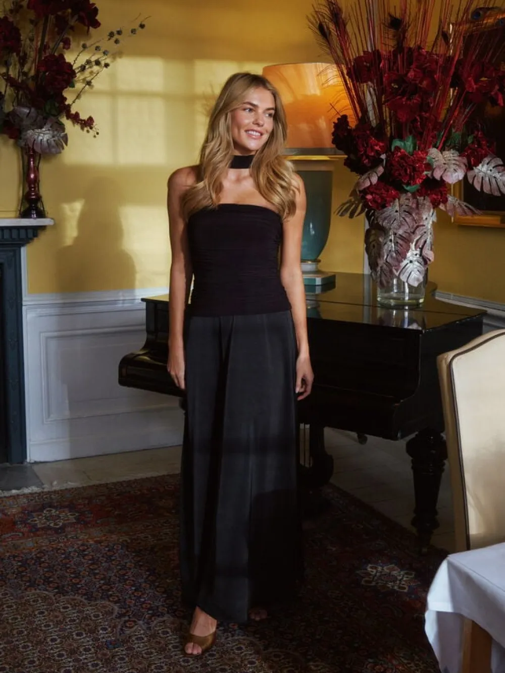 Maxi kjole med halsstrykke. Kjolens overdel er tætsiddende med rynkede detaljer, mens underdelen har vidde. Den har en dyb V-udskæring bagpå og lukkes med en skjult lynlås. Modellen er iført størrelse 36.