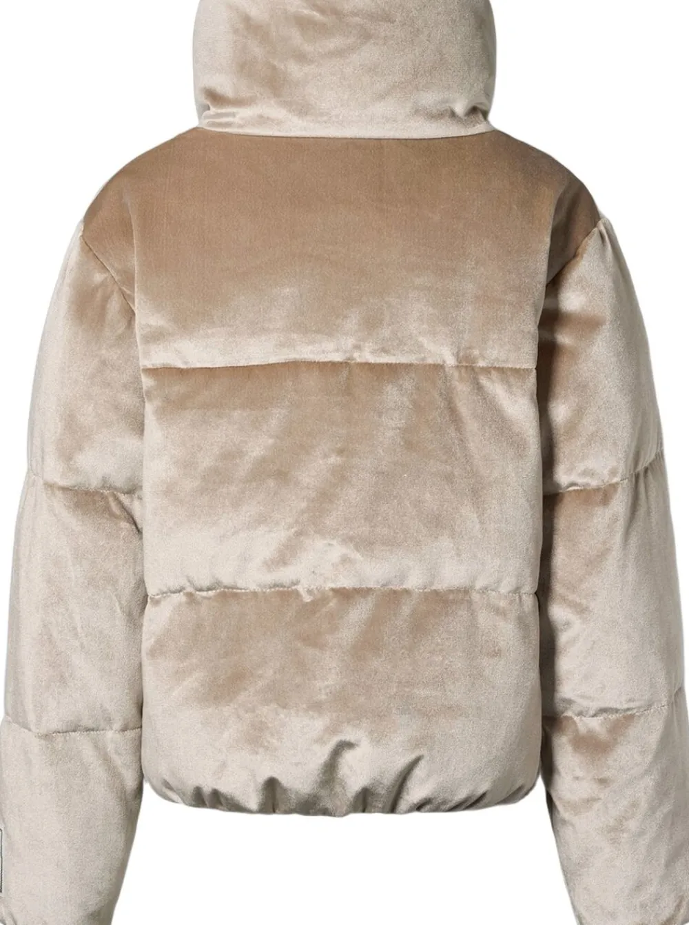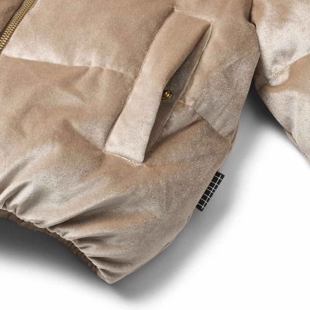 Jakke til børn i blød, imiteret pels fremstillet af genanvendt polyester.