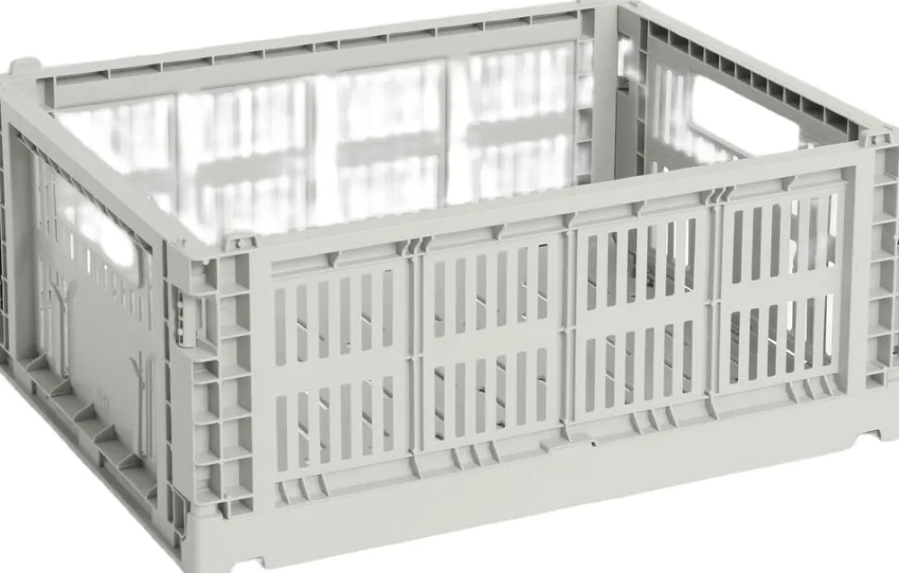 HAY Color Crate er en serie af farverige opbevaringskasser med et karakteristisk, perforeret design. Kasserne er lavet af 100% genanvendt plastaffald i en række forskellige farver og størrelser, og kan stables oven på hinanden i forskellige størrelseskombinationer. De multifunktionelle kasser er velegnede til at opbevare og organisere en lang række genstande på hylder, borde eller inde i skabe.