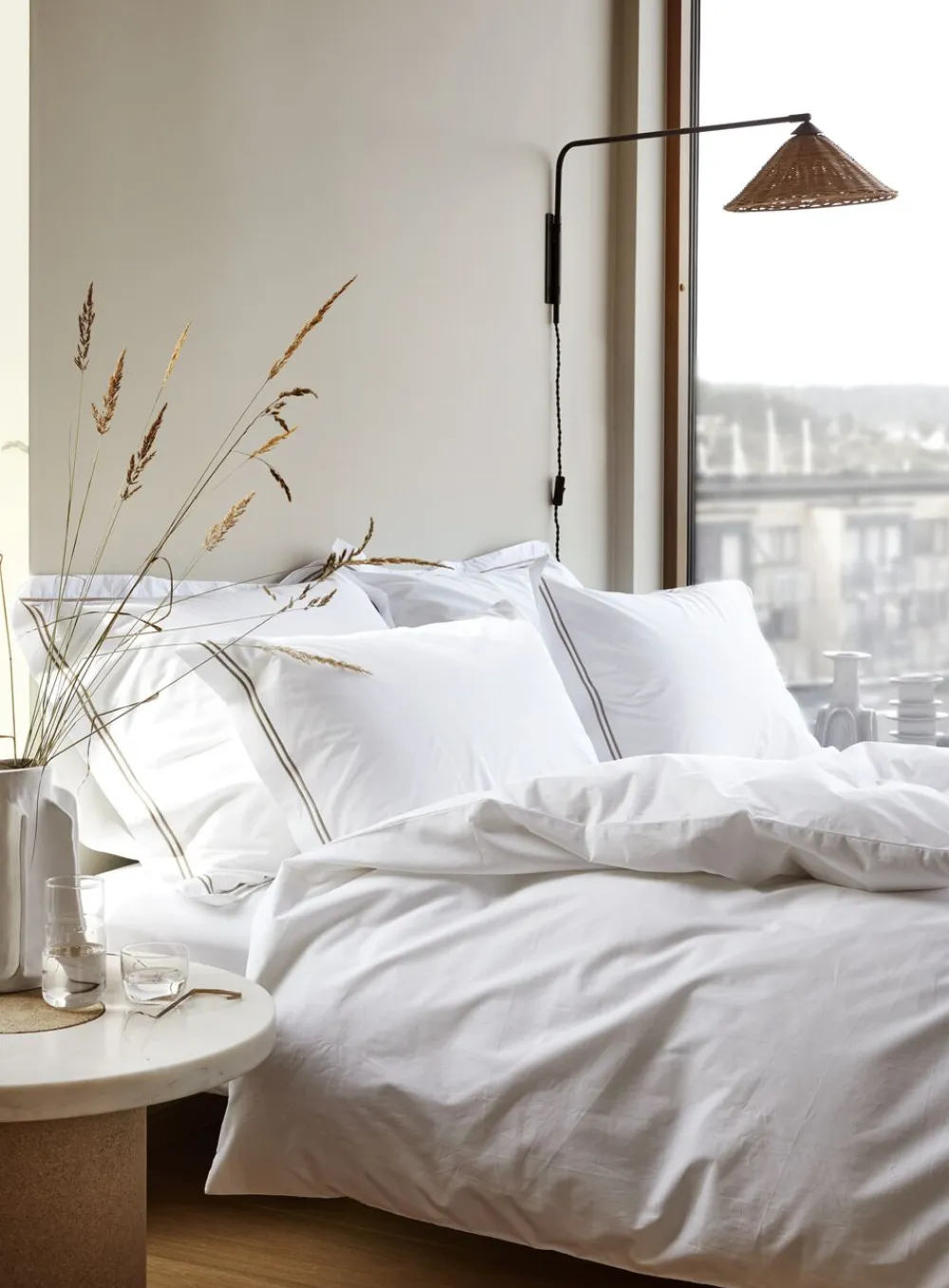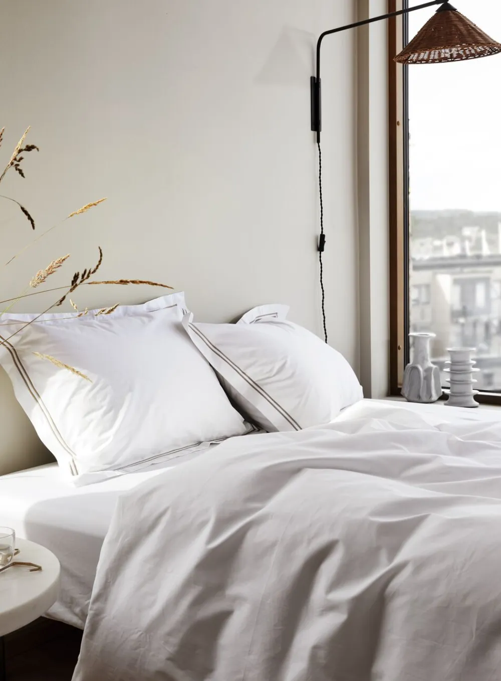 Høie Paris, en Nyhed i premium percale af 60% bomuld og 40% bambusviskose. Kvaliteten kendetegnes af en tættere vævning og den mærkbare kraftige kvalitet. Paris er ensfarvet hvid og har et elegant dessin med en dobbelt beige broderikant på spejlkanten af pudebetrækket. Bonusinfo: Bambus er den plante, som vokser hurtigst i verden, den er naturligt genanvendelig og behøver kun regnvand for at vokse. Bambusfibre er en fantastisk råvare, som omdannes til bambusviskose, og i kombination med bomuld, giver dette et sengetøj, som holder godt og længe. Paris er det perfekte valg til dig, som elsker den knitrende følelse, når du breder dynen over dig. Sættet kommer i stofpose. Oeko-Tex Made in Green certificeret.