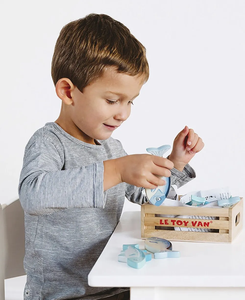 Friske fisk: Friske fisk. 6 stk. glitrende og flot malede træfisk der altid er helt friske. Det hele leveres i en fin trækasse der passer til markedsboden fra Le toy van.