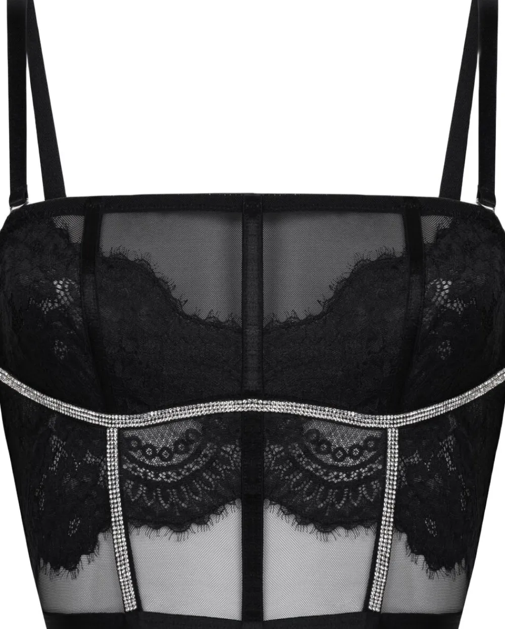 Gør et statement med denne fantastiske bustier. Den er designet med mesh- og blondepaneler og fremhæves af glimmer, der fanger lyset ved hver bevægelse. De ikke-vatterede skåle giver en naturlig silhuet, mens den strukturerede pasform former og støtter blidt. Fuldend looket med den matchende underdel.