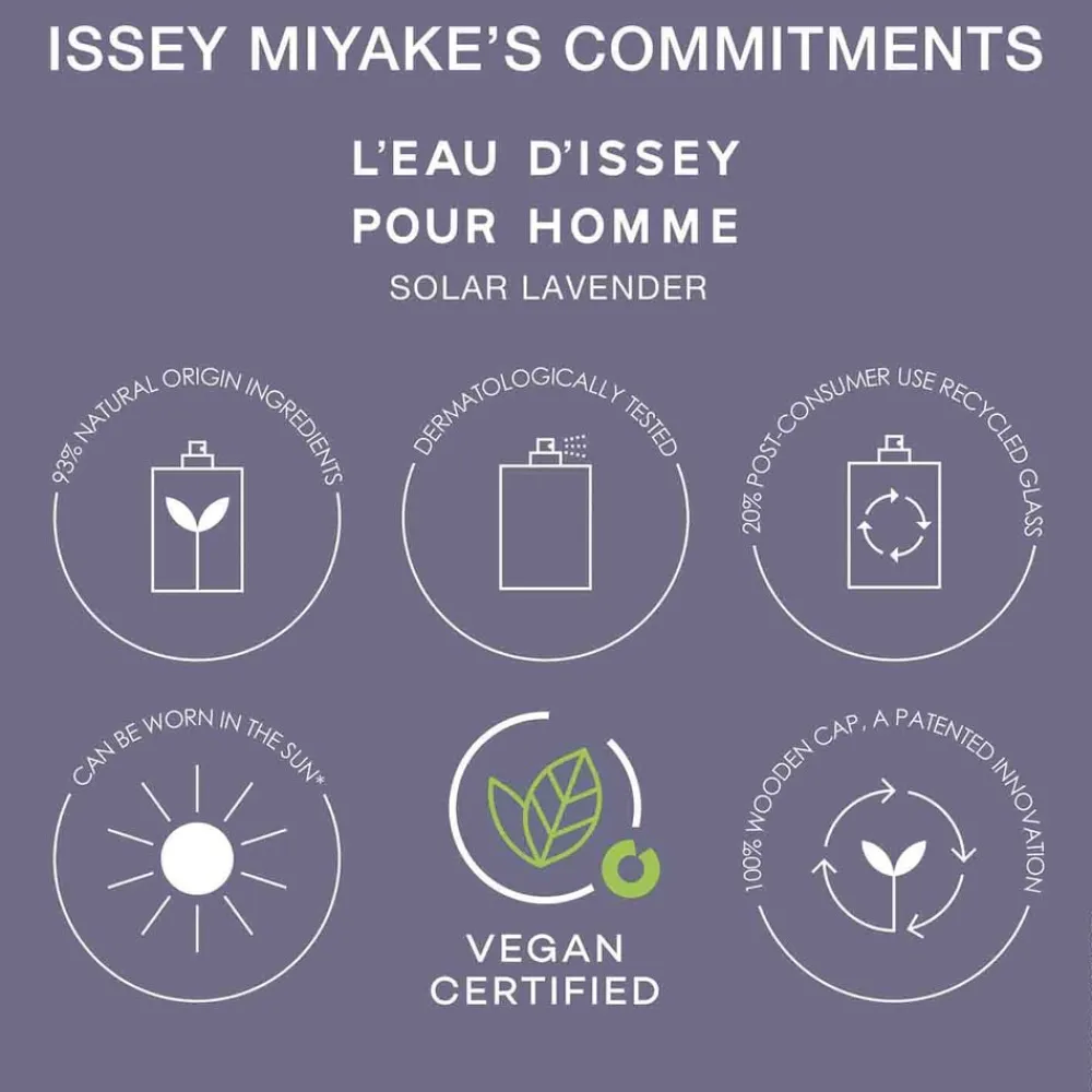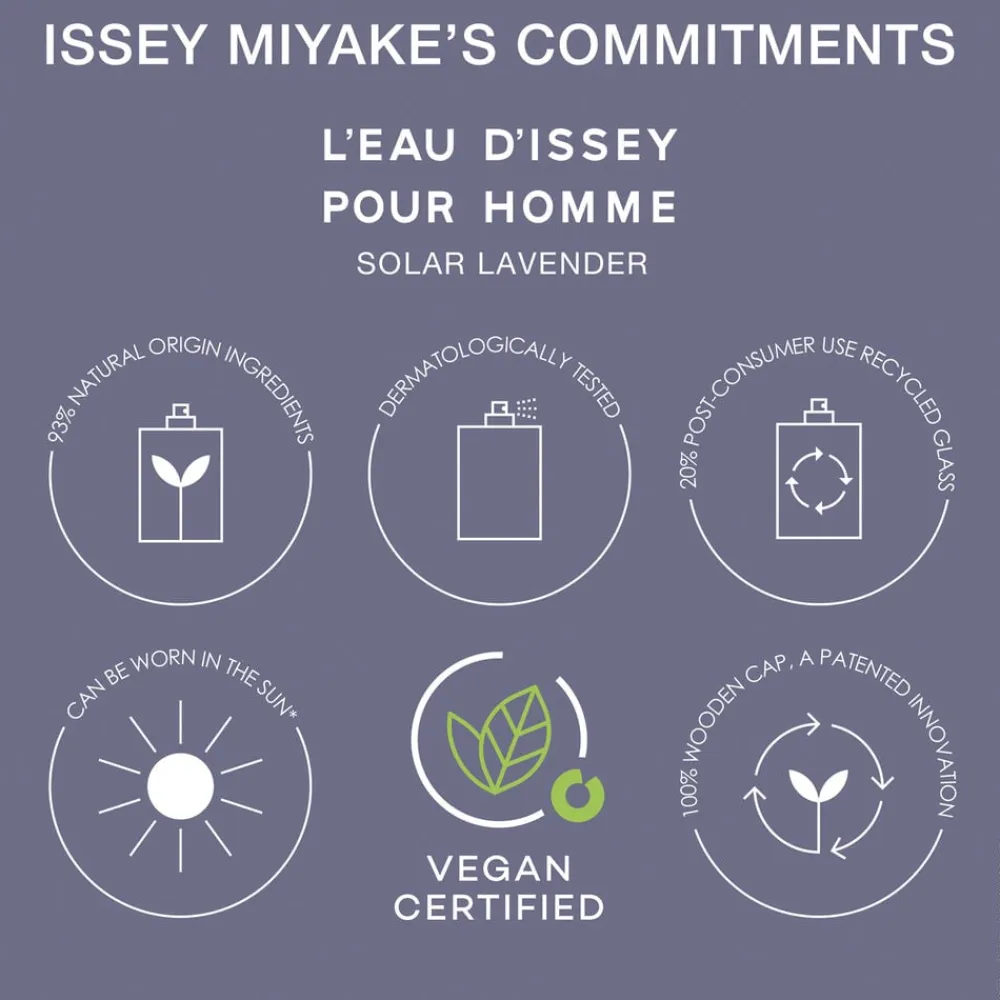L´Eau d´Issey pour Homme Solar Lavender Eau de Toilette Intense er en parfume til mænd fra Issey Miyake. Som født under solen, er denne maskuline duft et opløftende mesterværk fyldt med kontraster, hvor vand møder sollys for at skabe en moderne fortolkning af lavendel.EN KRYDRET, TRÆAGTIG DUFT TIL MÆND Som en fejring af naturen, afslører L´Eau d´Issey pour Homme Solar Lavender en kombination af lavendel og maritime duftnoter. Sichuan peber fremhæver den aromatiske friskhed og de varme facetter af den 100% naturlige, franske lavendel. I basenoterne intensiverer cedertræ den aromatiske duftsignatur.EN LAVENDEL-INSPIRERET PARFUMEFLASKEL´Eau d´Issey pour Homme Solar Lavenders flakon og æske er fyldt med lavendel – både indvendigt og udvendigt, da en lysende nuance af lilla pryder den maskuline herreduft. Den ikoniske flaske afspejler vandets renhed og er lavet af gennemsigtigt glas, mens den rene træhætte afspejler naturens unikke mønstre. EN PARFUME MED RESPEKT FOR NATUREN Den innovative top i 100% træ, der er skabt med et patenteret design, kræver ingen plastik. Dette reducerer miljøpåvirkningen. Flasken er lavet af 20% genbrugsglas. L´Eau d´Issey pour Homme Solar Lavender er en vegansk certificeret duft lavet med 93% naturlige ingredienser.