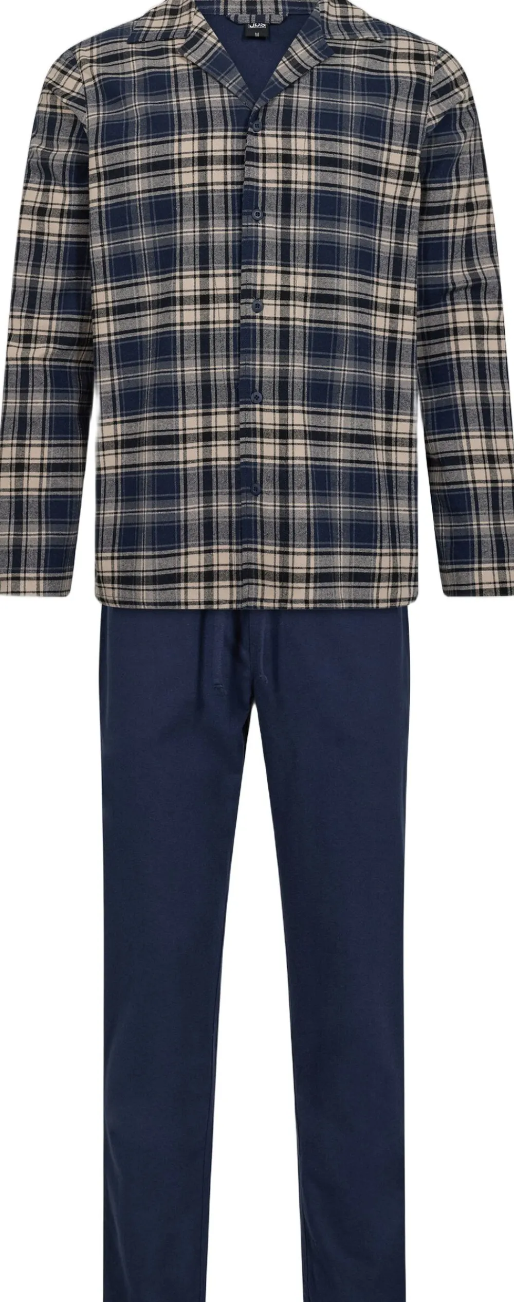 Dette pyjamassæt fra JBS er lavet af 100% bomuld, hvilket gør det blødt og behageligt mod huden natten igennem. Materialet er flannel, som føles varmt og komfortabelt, især i de køligere måneder. Sættet kommer i en klassisk navy farve, der passer til de fleste smag. Pyjamasen er designet til voksne mænd og har en afslappet pasform, så der er god bevægelsesfrihed. Bukserne har elastik i taljen og skjorten lukkes med knapper. Med denne pyjamas får du solid kvalitet og komfort til aftener og nætter hjemme.