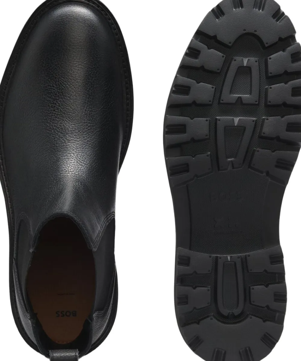Disse BOSS herretøj Chelsea-støvler er en elegant udgave af en afslappet klassiker, der har en kraftig ydersål. Overdel i kornet læder. Elastiske paneler. Dette produkt indeholder mindst 60 % bedre råmaterialer. Vi søger løbende efter mere ansvarlige måder at producere og færdiggøre vores produkter på. minimum 60 % af det læder, der bruges til at fremstille dette produkt, er indkøbt fra certificerede garverier