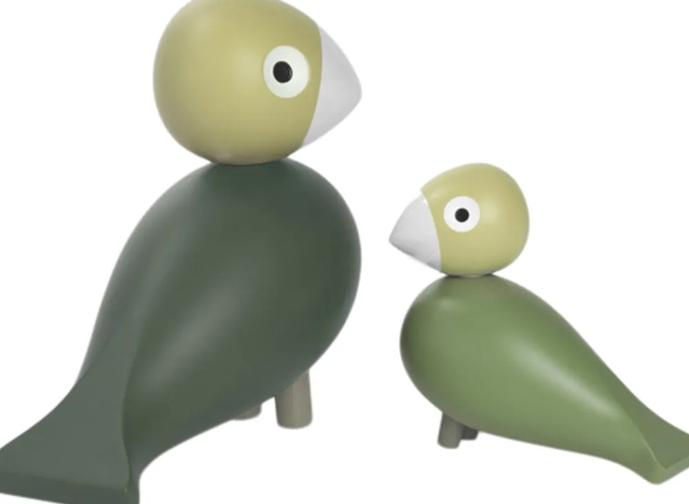 Til fejringen af dine livsbegivenheder, et minde om alle hverdagslivets lykkelige stunder og den helt særlige relation mellem forældre og børn. Med Liv&Lykke-fugleparret i det ikoniske Kay Bojesen-formsprog spredes vingerne ud for alle, der holder af og passer på hinanden. Fugleparret er fremstillet i bøgetræ og består af en stor og en lille fugl, som I kan vælge at bruge sammen eller hver for sig til at udtrykke jeres unikke fortælling, lige præcis dér hvor I er i livet. Den store fugl kommer i en afdæmpet mørkegrøn og er med sine 10 cm i højden en anelse mindre end de andre i Kay Bojesens populære serie af sangfugle, mens den lille fugl på 6 cm med en krop i en lidt varmere grøngul er samme størrelse og nøjagtig lige så nuttet som de fugle, du kender fra Kay Bojesen-uroen i Babies-serien med fugle og kugler i træ, malet i forskellige farver. For at markere fugleparrets iboende forbundethed er hovedet på begge Liv&Lykke-fugle malet i samme beige farve og med ens hvide næb. Et symbol på at de både helt tæt sammen og hver for sig altid vil passe på hinanden. Liv&Lykke er formet af kærlighed, håb og omsorg og en dybt forankret hyldest til selve livet. Uanset hvilken historie du fortæller, føjer Liv&Lykke et nyt kærligt kapitel til historien om dansk design og Kay Bojesens originale fortællinger i træ. Lad for eksempel begge fugle stå sammen i soveværelset i barnets allerførste måneder som en rede af lykke så fin som de blødeste fjer, og lad herefter den store fugl flyve med det lille barn ind på børneværelset eller omvendt. Og senere i livet kan I så give det nu store barn den lille fugl med på efterskole eller på udlandsrejsen og beholde den store fugl derhjemme som et smukt og livgivende symbol på evig forbundethed, uforbeholden kærlighed og et håb for en lykkelig fremtid for et ungt menneske. Som dette særlige dualistiske designikon vil Liv&Lykke-fugleparret også være den helt perfekte gave til den nybagte storesøster eller storebror eller som en kærlig hilsen mellem to venner, som et symbol på livets store og små øjeblikke, et fokus på samhørighed og lykkelige stunder sammen. Med deres elegante og universelle grønne farver vil Liv&Lykke-parret stå som en for evig stedsegrøn blomsterbuket i fugleform, der vil passe perfekt ind i ethvert hjem. Og ligesom Liv&Lykke-navnet selvfølgelig emmer af livslykke og familiær forbundethed, er også farverne fulde af symbolik. Grøn er naturligvis håbets farve og symboliserer netop den frodighed, det liv og det spirende håb af lykke, der omfavner livets små og store mirakler. Den grønne fjerpragt og de varme gule nuancer giver Liv&Lykke et afbalanceret og harmonisk look, der vil skabe en rede af liv og lykke, hvor end de placeres.