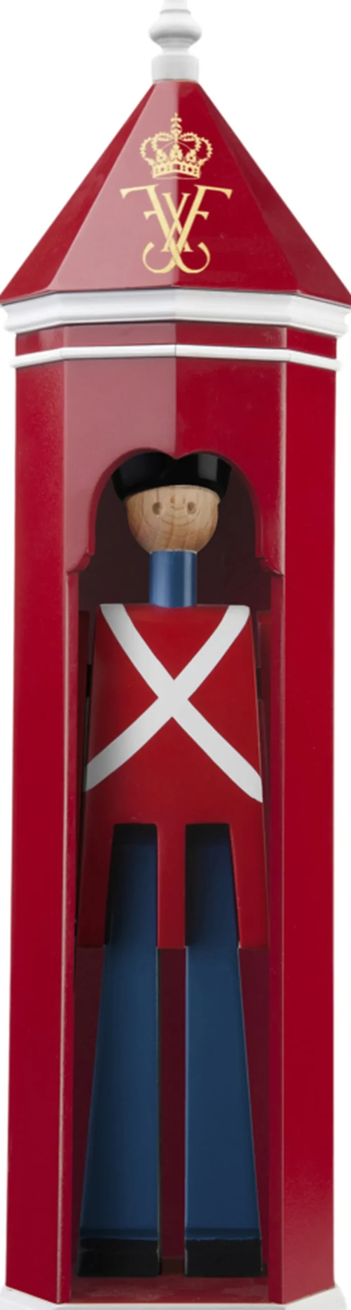 Giv dine gæster en royal velkomst med det flotte skilderhus i træ til de fine gardere fra Kay Bojesen. Kay Bojesen kunne som ingen anden skabe originale fortællinger i træ. Han kunne få træet til at leve, og det gør det hele vejen igennem serien af træfigurer den ene mere ikonisk end den anden. Dette unikke skilderhus er som alle de berømte Kay Bojesen-gardere inspireret af et af Danmarks nationalsymboler fra Amalienborg Slotsplads. Kay Bojesen skabte garderne for første gang i 1940 i anledningen af Kong Christian Xs 70-årsfødselsdag som en hyldest til den danske konge, og med det nye skilderhus kan du både fejre dine fødselsdage derhjemme med manér og hylde den nye Kong Frederik X. Skilderhuset måler 36 cm i højden og er nedskaleret efter originale tegninger af Forsvarets skilderhuse. Den Kongelige Livgarde har stået vagt ved de danske slotte siden 1658, og nu kan du give din garder husly med det smukt udførte skilderhus i træ, der er malet i de traditionelle røde og hvide farver og dekoreret med det kongelige monogram i guld.