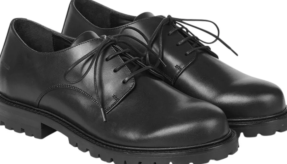 Enkel snøresko i læder med sort tracksål. Skoen har en rund snude, fast hælkappe, vatteret indersål, kromfrit læderfoer og er udformet i naturligt og åndbart skind.