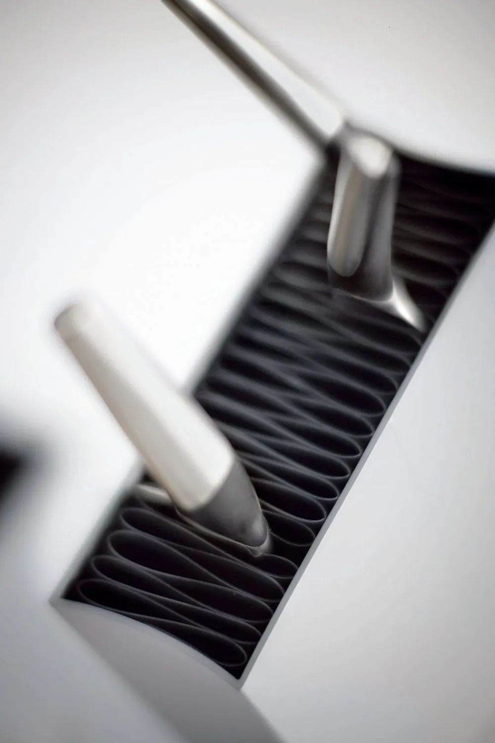 En fleksibel harmonika af plast holder knive og andre redskaber på plads. Kabinet af kraftigt aluminium. Fås i en lige og en vinklet udgave.