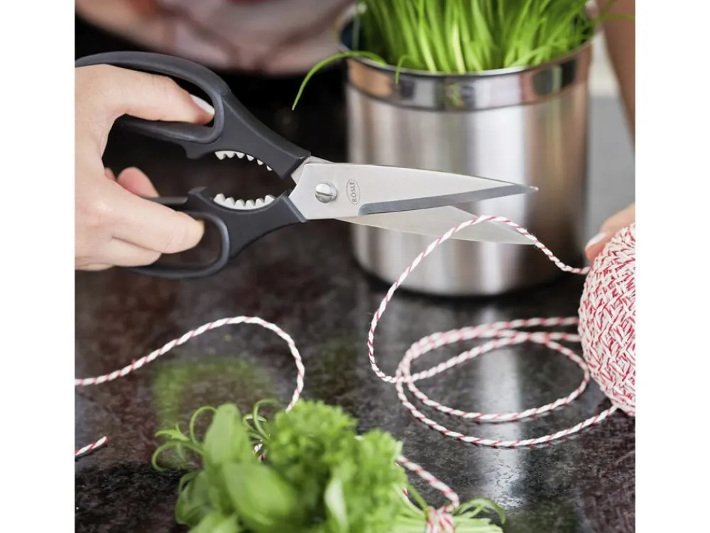 Saks i hærdet rustfrit stål med mikro-savtakkede blade, der sikrer en præcis klipning. Perfekt til brug på et stort udvalg af materialer i køkkenet. Klipper meget nemt, også tyndt folie og klude. Det fleksible plasthåndtag ligger komfortabelt i hånden. Saksen kan nemt skilles ad ved rengøring. Velegnet til venstrehåndede. Ikke egnet til opvaskemaskine. (R96290)