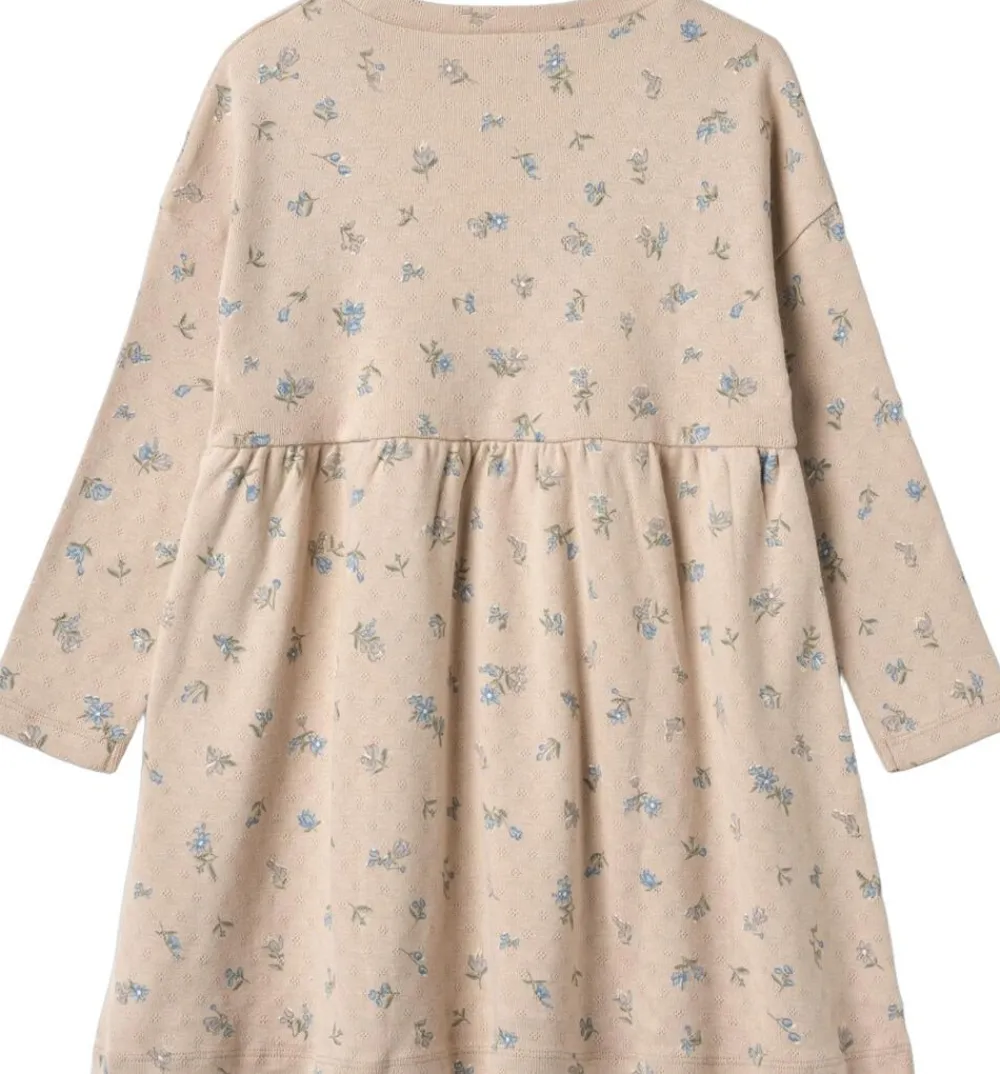 Langærmet jerseykjole med print i blødt økologisk bomuld til børn. – Løstsiddende – Længde: Over knæene – Lav skuldersøm – Skæring over taljen med læg nedenfor – Wheat signaturprint Wheat’s kjole har en løstsiddende pasform, hvilket gør den nem og behagelig for dit barn at have på. Kjolen har en flatterende skæring med læg og fylde, hvilket giver kjolen god volumen i skørtet. Kjolen er perfekt til efteråret og vintermånederne og kan let styles med nogle leggings og en langærmet T-shirt under. Style kjolen med en cardigan på de kølige dage for at fuldende looket. — 100% Økologisk bomuld