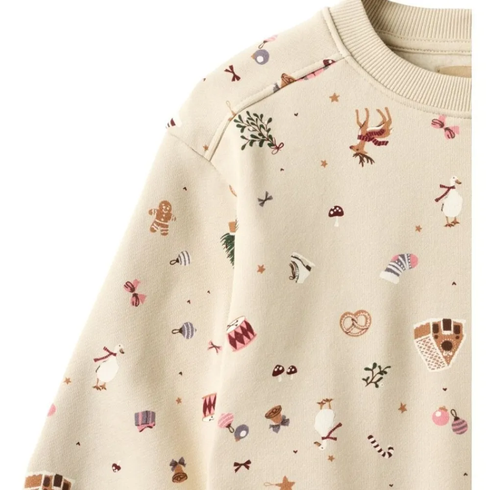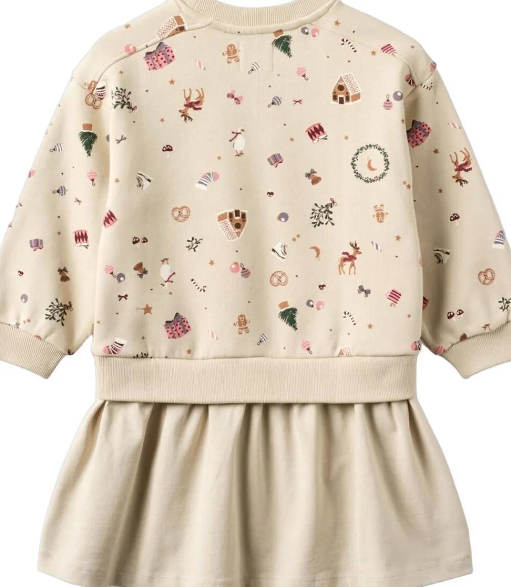 Langærmet sweatkjole i blødt økologisk bomuld til børn. – Løs pasform – Blød rib ved halsudskæring, manchetter og forneden – Lav skuldersøm – Bærestykke ved hoften – Ekstra stof som nederdel – Wheat signatur juleprint Wheats søde kjole har en løs pasform, som gør den nem og behagelig for dit barn at have på. Kjolen er perfekt til efterårs- og vintermånederne og kan styles med bløde strømpebukser og en cardigan eller strik udover. — – Standard 100 by OEKO-TEX® – 100% Økologisk bomuld – GOTS certificeret