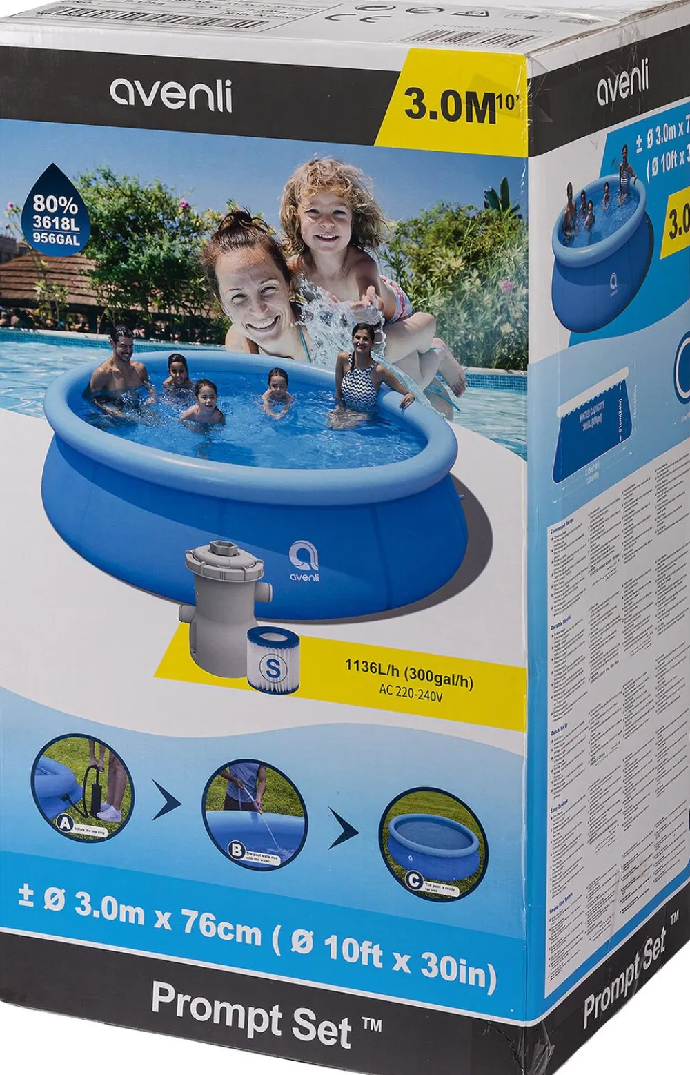 Mega poolsæt 3600 ltr (80% fyldt) mega pool med oppustelig topring og filterpumpe der pumper ca 1135 liter i timen Måler 300×76 cm Nem og hurtig opstilling Inkl udførlig brugsvejledning og reparationskit
