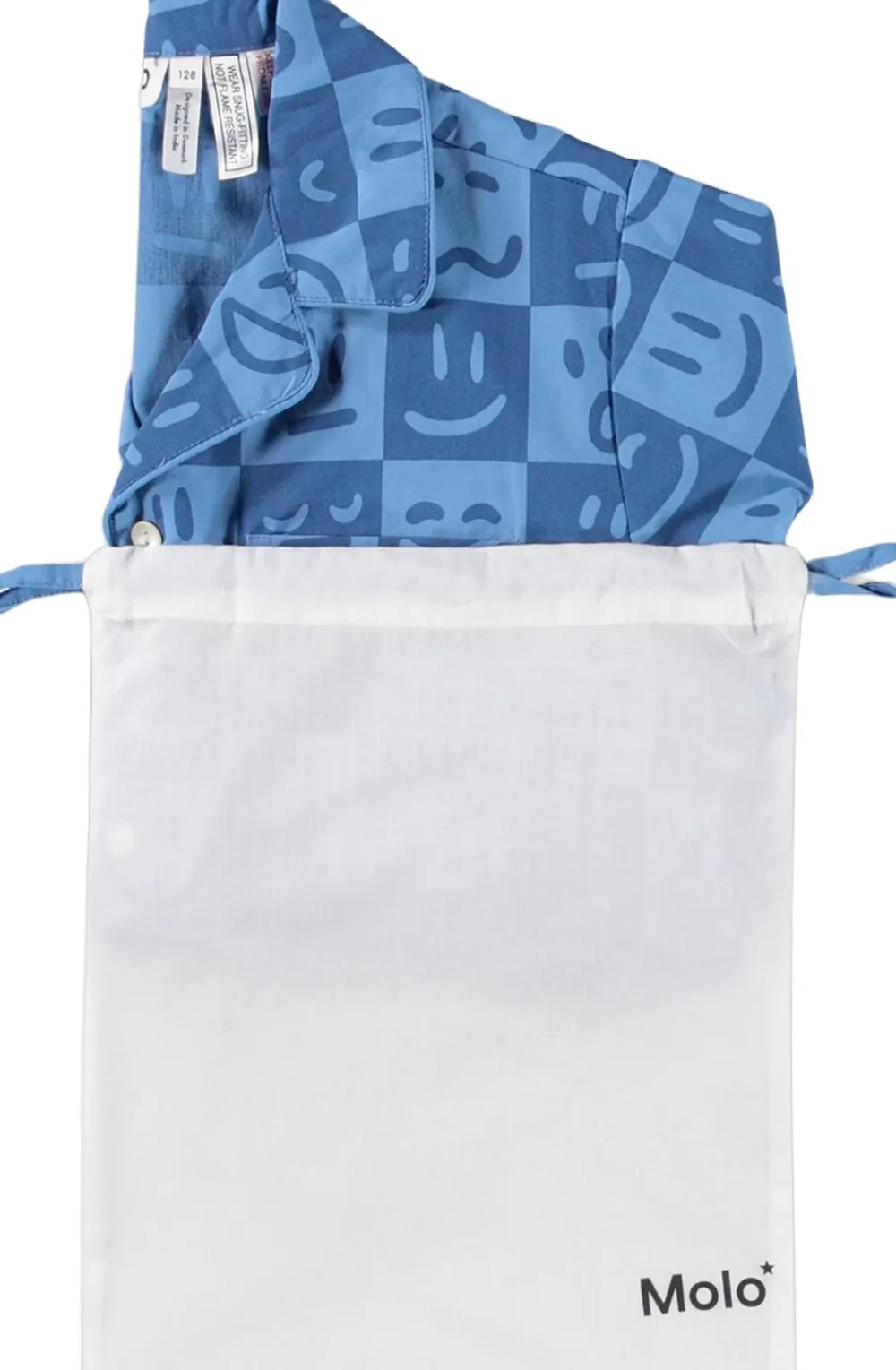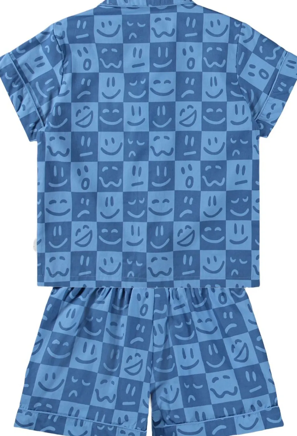 Todelt pyjamas i blød bomuld med korte ærmer og ben. Skjorten har en klassisk krave og knaplukning, mens shortsene er funktionelle med elastik og snøre i taljen for optimal pasform. Det humoristiske print med ansigtstræk gør sættet sjovt og indbydende for børn. Ideelt til en god nats søvn eller hyggestunder derhjemme.