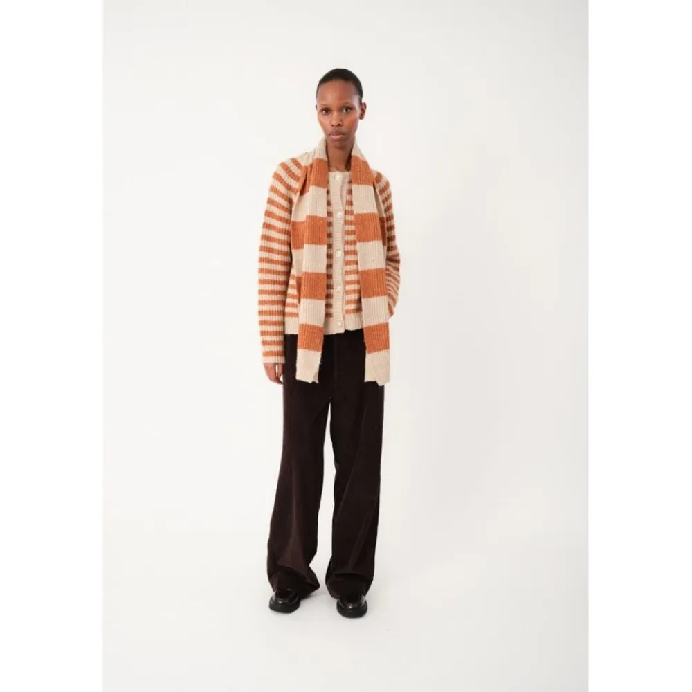 MountainLL tørklæde er en strikket klassiker med brede striber i enten mørkeblå eller rust kombineret med en varm sandtone. Den har en afslappet, kraftig tekstur, der er perfekt til din efterårs- og vintergarderobe. Strikket tørklæde med brede striber i mørkeblå eller rust. Blød kvalitet. Målinger: Bredde- 25 cm, længde- 170 cm