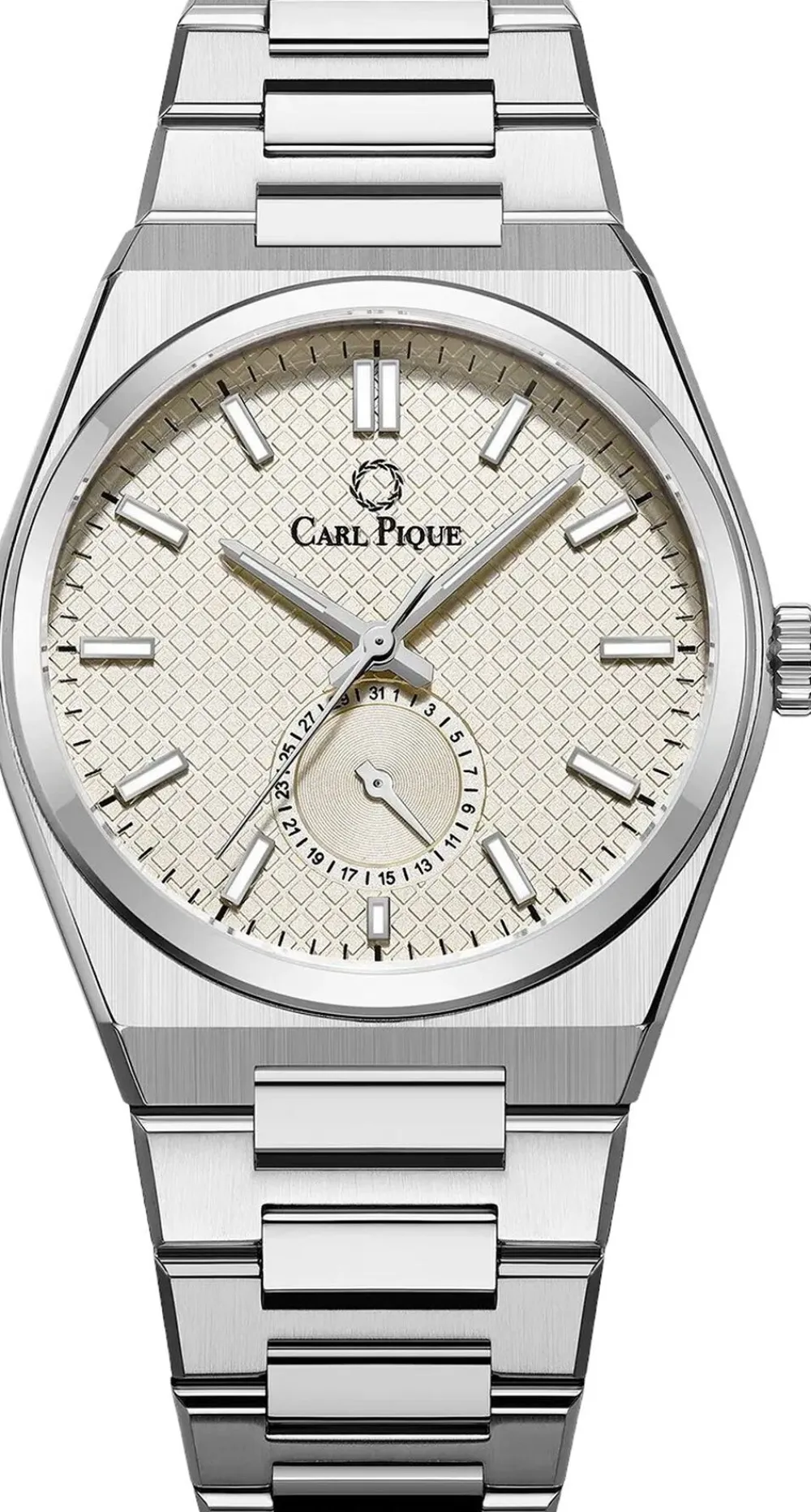 Carl Pique Lorenzo CP0051 skiller sig ud med sin klassiske runde urskive indkapslet i en geometrisk urkasse, der giver et moderne udseende. Det teksturerede mønster på urskiven tilføjer visuel interesse og dybde, mens den beige farve skaber en varm kontrast mod den sølvfarvede urkasse og bezel. En kronograf er placeret nederst på urskiven og tilbyder ekstra funktionalitet. Uret er udstyret med kvarts urværk drevet af Epson VX3Y kaliber.