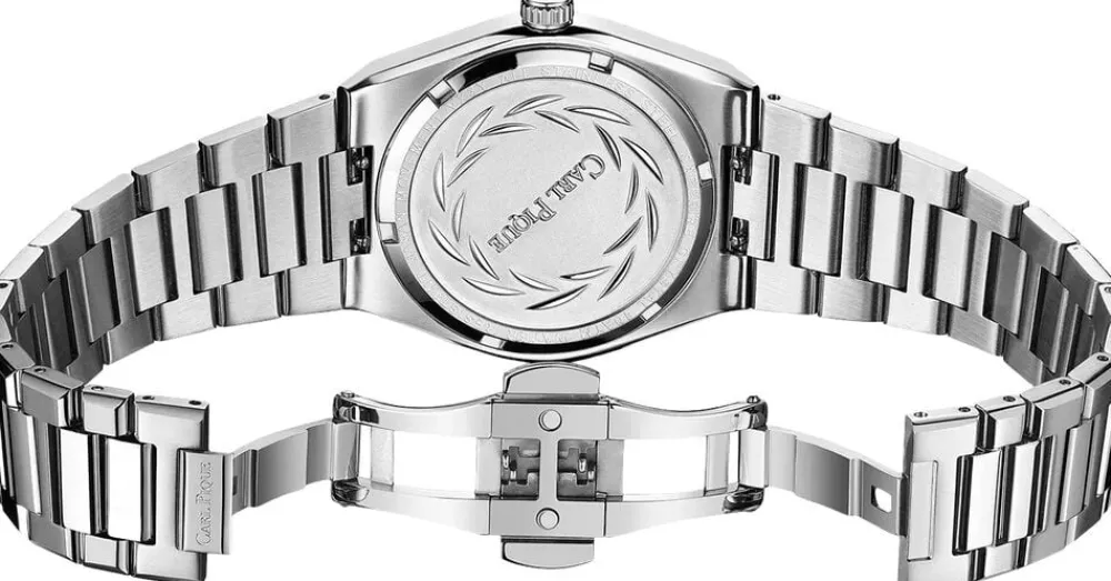 Uret har en diameter på 38 mm, hvilket gør det til et stilfuldt, men diskret tilbehør til enhver lejlighed. Det er vandtæt op til 10 ATM, hvilket gør det egnet til svømning. Stål-lænken komplementerer den sølvfarvede urkasse, og butterfly låsen sikrer en sikker pasform. Lumen på viserne forbedrer synligheden i svagt lys. Fremstillet af 316L kirurgisk stål, er uret parret med safirglas, der giver beskyttelse mod ridser.