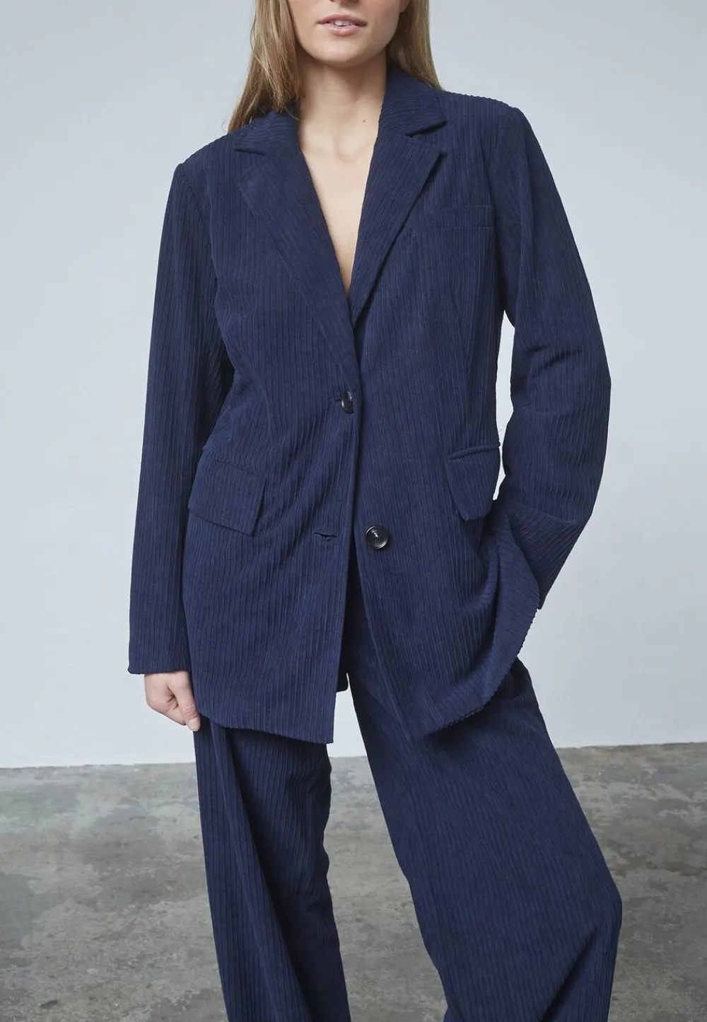 er en fløjlsblazer med en let oversized pasform. Blazeren har to luknings knapper og to påsyede lommer foran. Modellen har en str. S på.