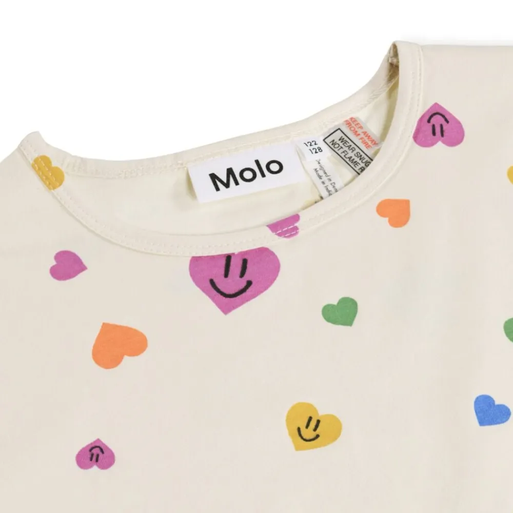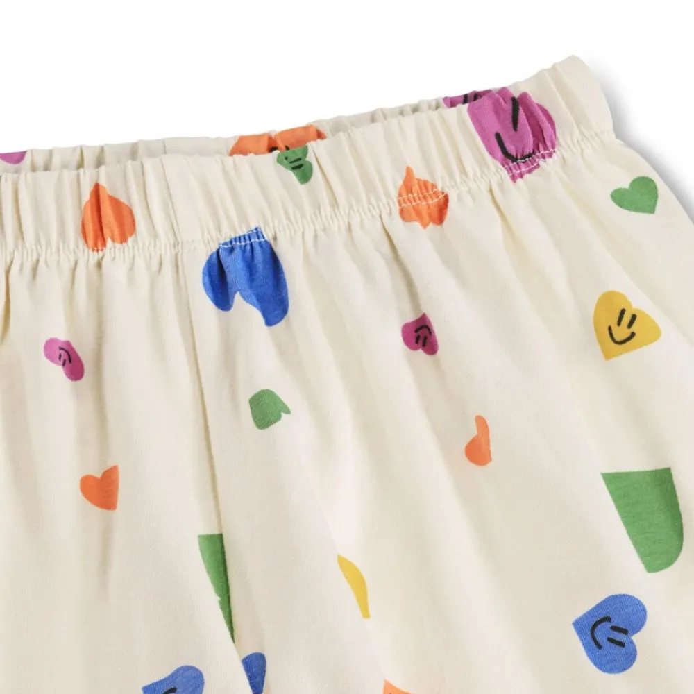 Lækkert nattøj med korte ærmer og ben, fremstillet i blødt, strækbart bomuld. Dette todelte sæt inkluderer en løs t-shirt med rund hals og shorts med elastik i taljen for optimal komfort. Det festlige print af smilende hjerter gør det til et sjovt valg til sengen, som både børn og forældre vil elske. Perfekt til afslappede nætter og hyggelige stunder.
