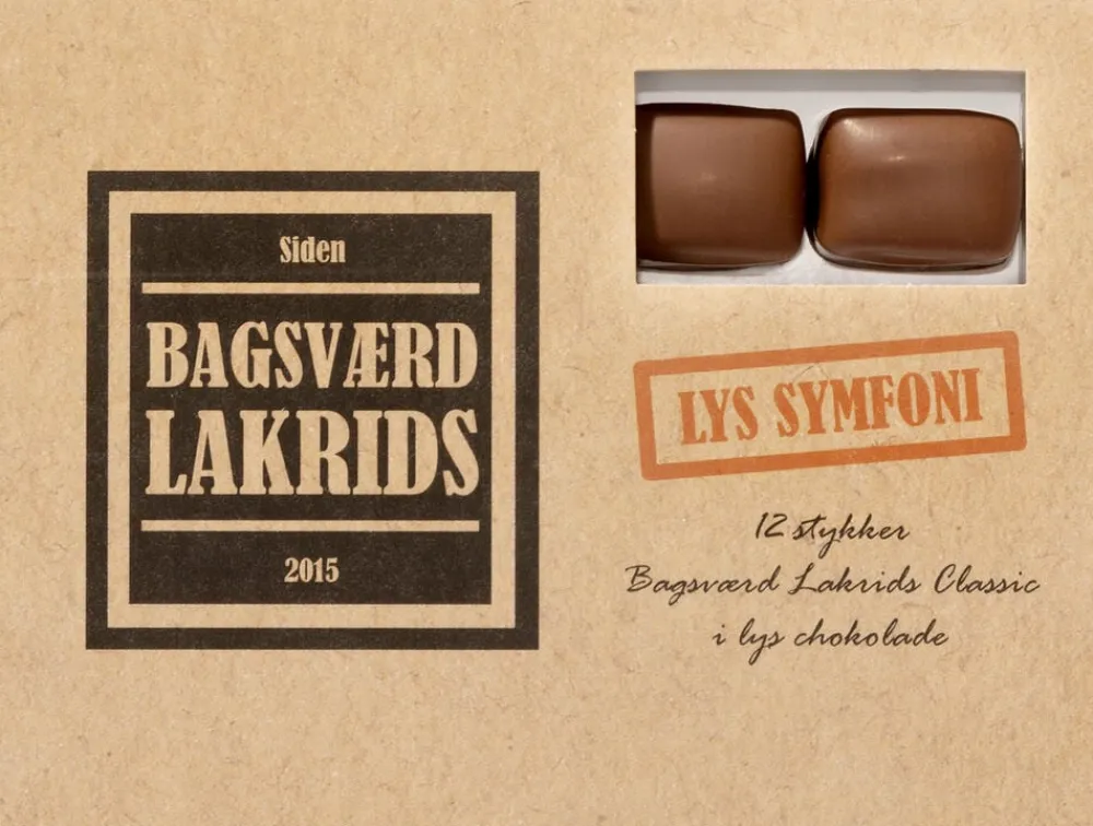 Lys Symfoni. Håndlavet dansk kvalitet. Den guldvindende Bagsværd Lakrids Classic er fremstillet i Bagsværd og overtrukket med lys chokolade. Classic Lakrids har sin karakteristiske smag, fordi den fremstilles af det fineste lakridspulver, og fordi den frembringes af Maillard-reaktionen, hvor mælkeprotein og sukker reagerer med hinanden i gryden. Efter kogning hældes lakridsen i forme, hvor den størkner natten over. Herefter udskæres den og føres gennem et slør (eller gardin) af flydende chokolade. Efter tørring er den klar til at blive spist.