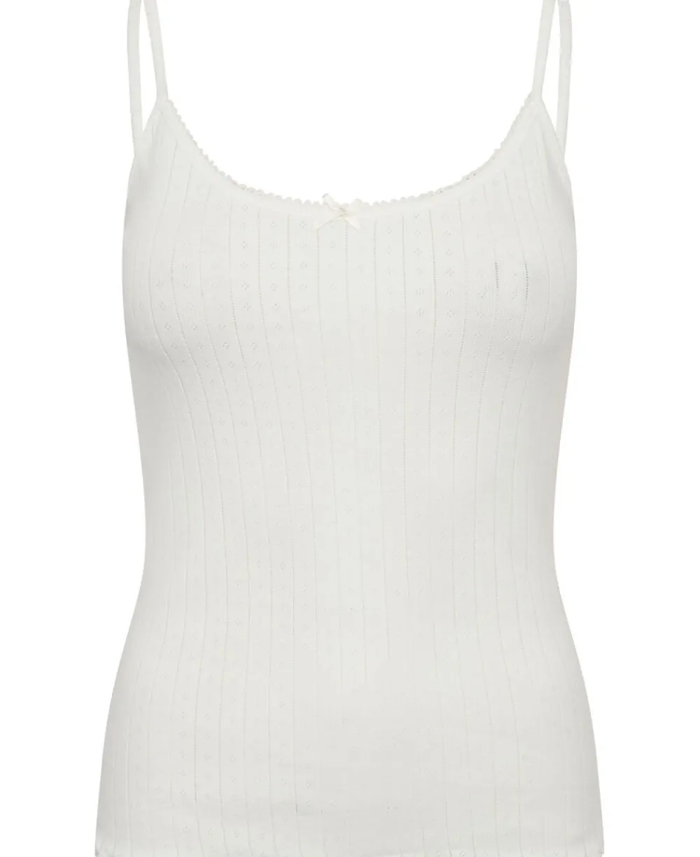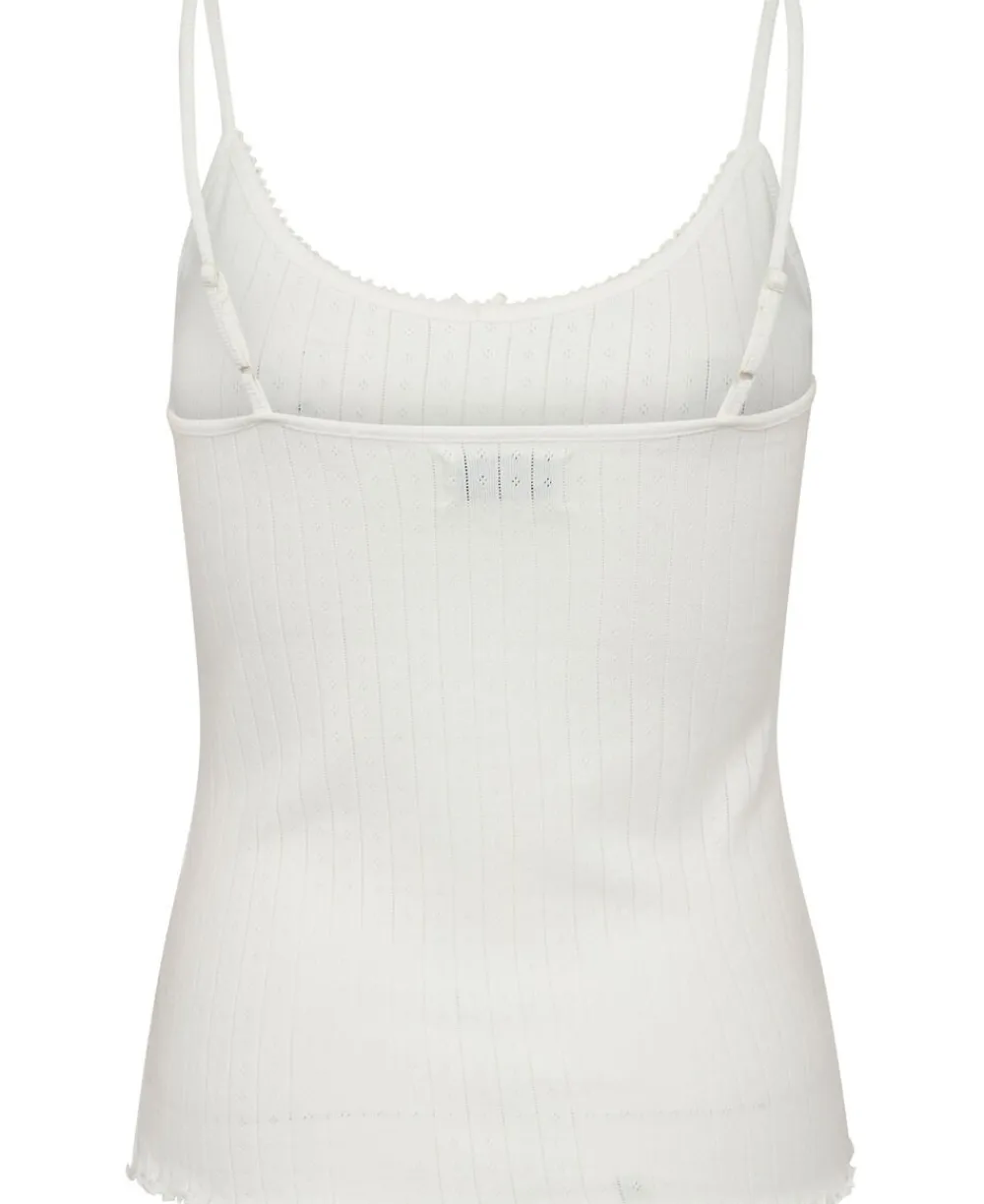 Top fra Magasin du Nord Collection i den blødeste kvalitet af 100% økologisk bomuld med GOTS-certificering. Toppen er enkel i modellen med et fint mønster, smalle skulderstropper, rib og blondekant i den runde halsudskæring samt elegante bølgekanter i bunden. En skøn top i den lækreste kvalitet.