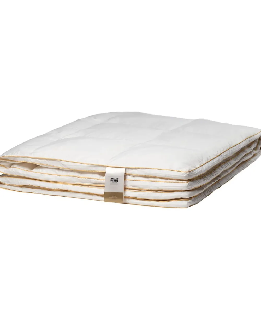 Guld Moskusdun Täcke – Medium 150×210 cm: indeholder 560 g Hvide moskusdun med Bæreevne/isoleringsevne 700. Lækker dyne med de blødeste dun, våret er 100% Bomuld satin, hvilket giver et lækkert blødt og åndbart produkt. Hold hovedet koldt og kroppen varm med en Magasin Guld Moskusdun Lun Helårsdyne, som holder dig varm hele natten året rundt. Den lune Moskusdun helårsdyne er anbefalet til dig, der har en medium kropstemperatur eller middel rumtemperatur. Moskusdundynen er syet i kassetter, hvilket sikrer dig en jævn fordeling af fyldet og en fyldig dyne hver eneste dag. Dynen er NOMITE-, Oeko-Tex- og Downpass-certificeret. En dyne til dig, hvor kun det bedste er godt nok.