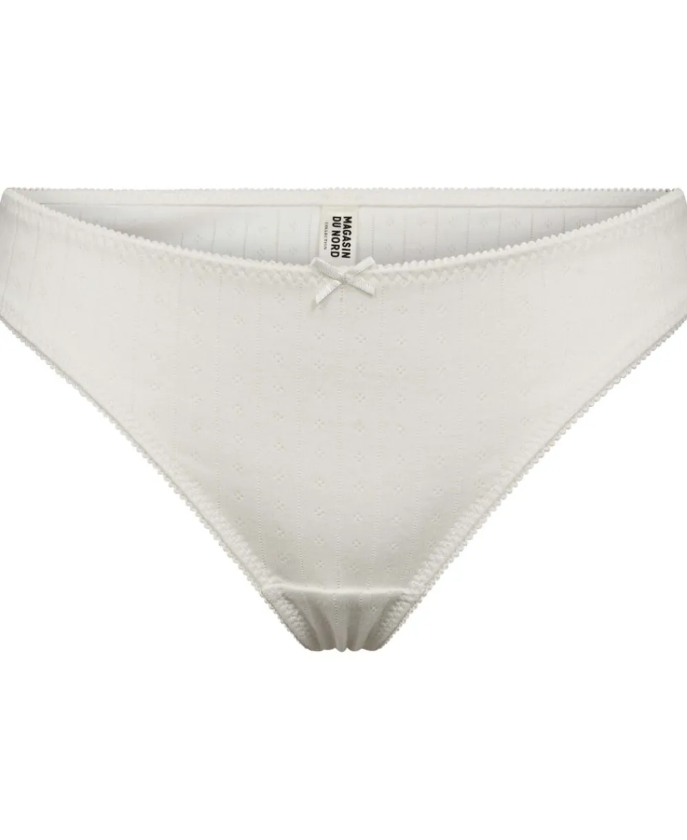 G-streng fra Magasin du Nord Collection i den blødeste kvalitet af 100% økologisk bomuld med GOTS-certificering. G-strengen er enkel i modellen med det fineste hulmønster, en foret kile, fine blondekanter samt en lille sløjfe på fronten. En skøn g-streng i den lækreste kvalitet.
