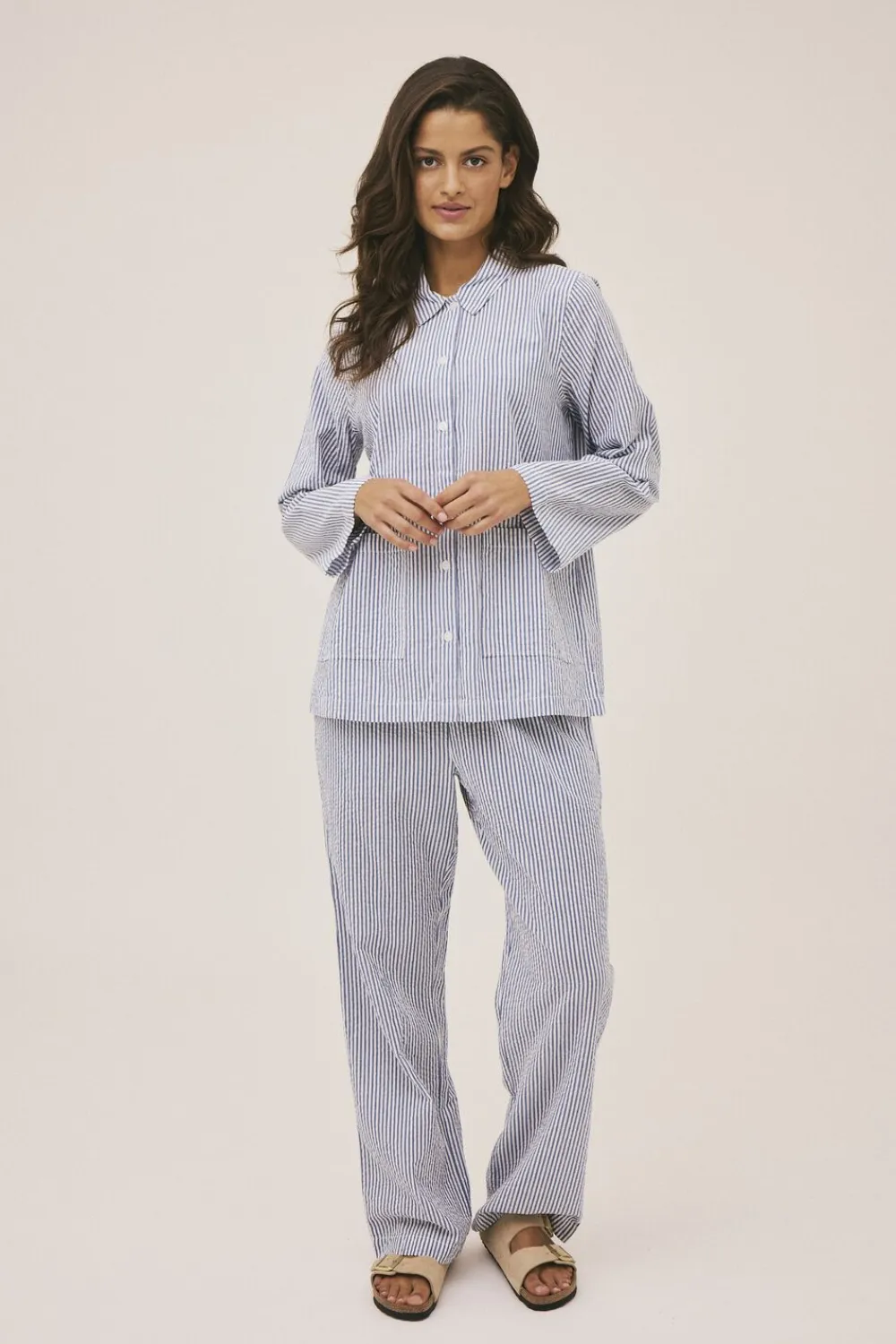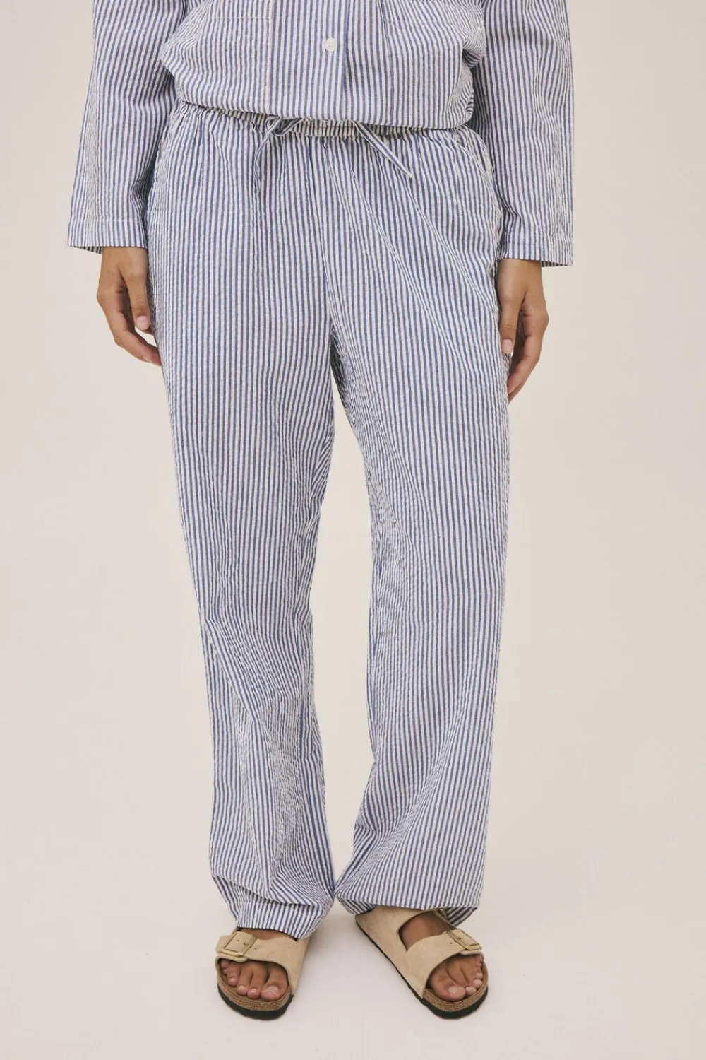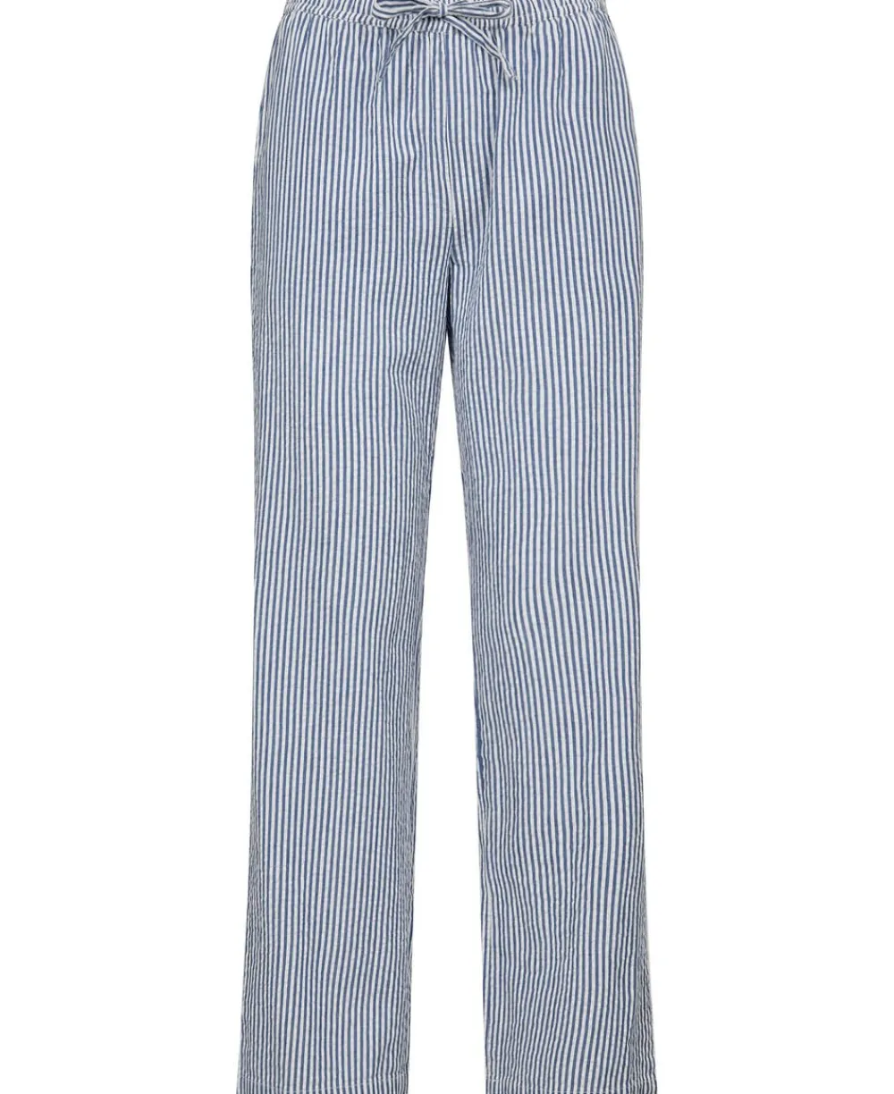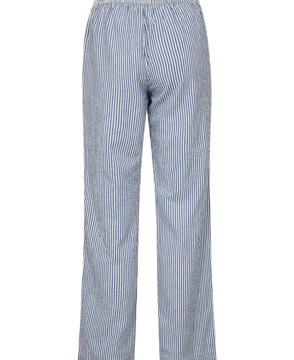 Bukser fra Magasin du Nord Collection i den blødeste kvalitet af 100% økologisk bomuld med GOTS-certificering. Bukserne har det fineste, stribede print, elastik og bindebånd i taljen, sidelommer samt lige bukseben med en løs pasform. Et par skønne bukser i en lækker kvalitet.