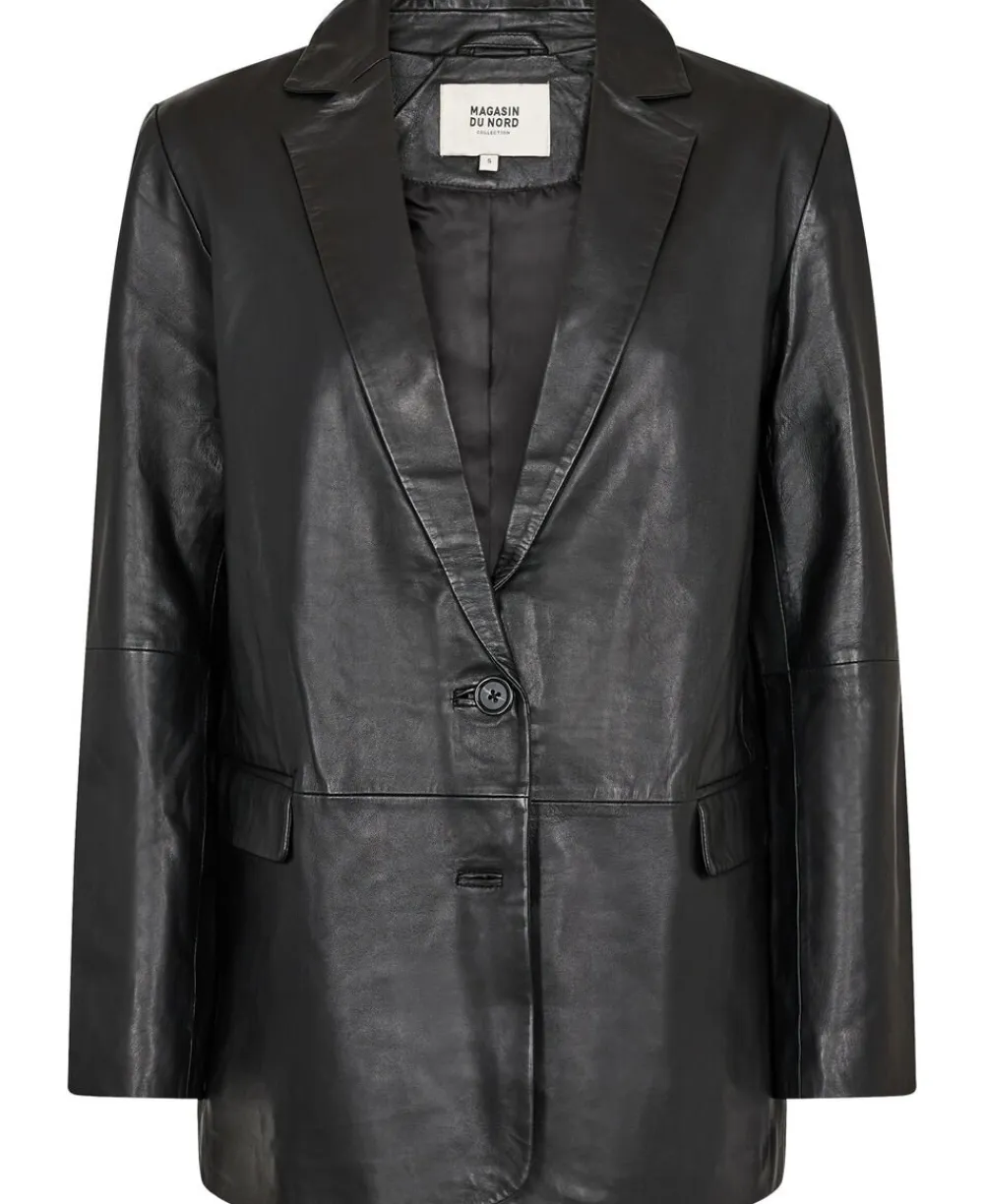 Jakke fra Magasin du Nord Collection i en lækker kvalitet af 100% læder. Jakken er enkel i modellen med lange ærmer, knaplukning, frontlommer, V-udskæring med revers, en slids bagpå samt en løs pasform. En skøn jakke i lækker kvalitet.