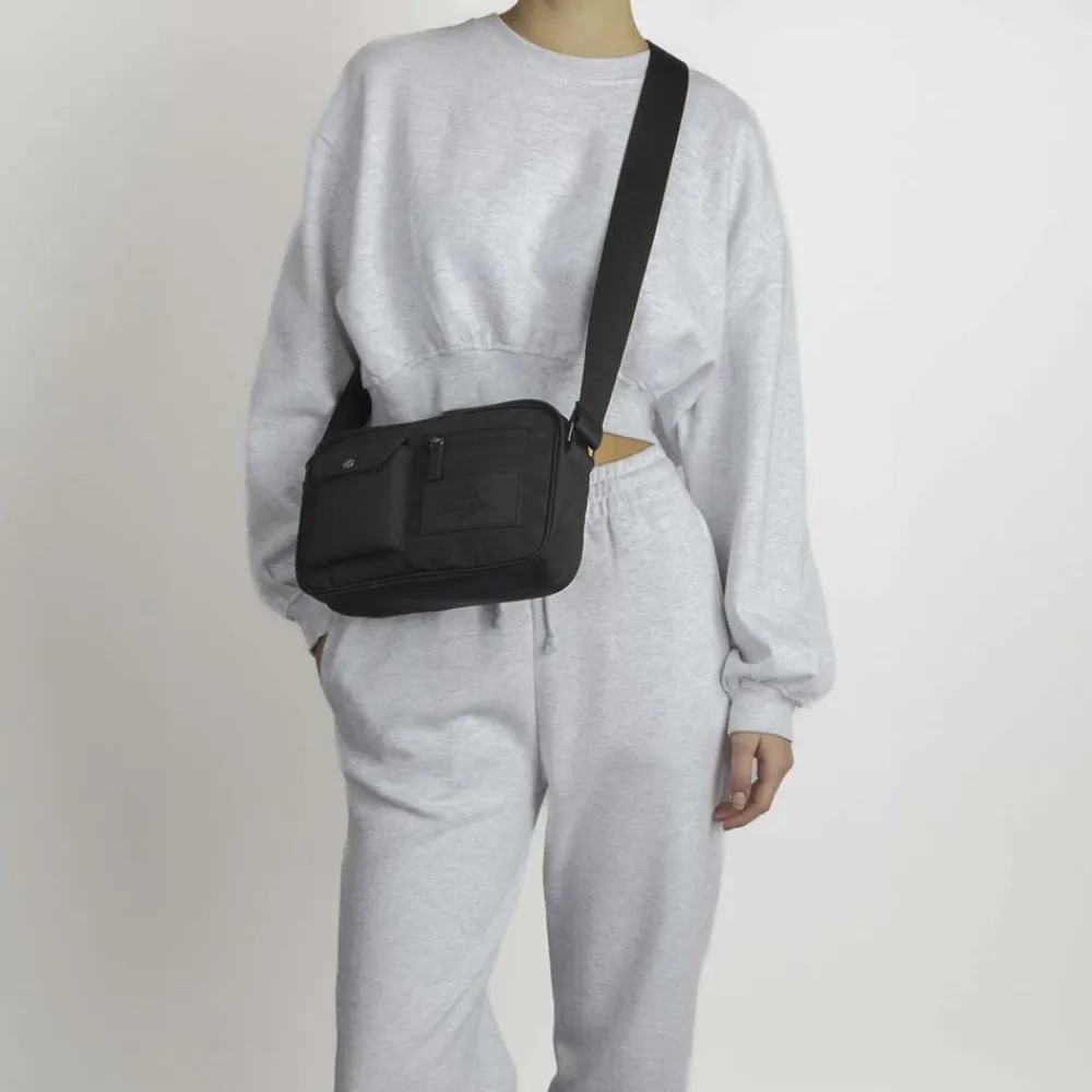 Darla Crossbody Monochrome fra Markberg er en praktisk crossbody taske som er produceret i 100% genanvendt polyester. Tasken er vandafvisende og lavet i et ekstra slidstærkt materiale. Tasken lukkes med lynlås og har en lille lomme og lynlåsdetaljer på fronten. Tasken har en lille lynlåslomme samt to små lommer indvendig. Markberg logoet på fronten er lavet i vegansk silikone, hvor der ikke er brugt animalske materialer. Tasken for er 100% genanvendt polyester. Mål: 26 cm x 16 cm x 7 cm