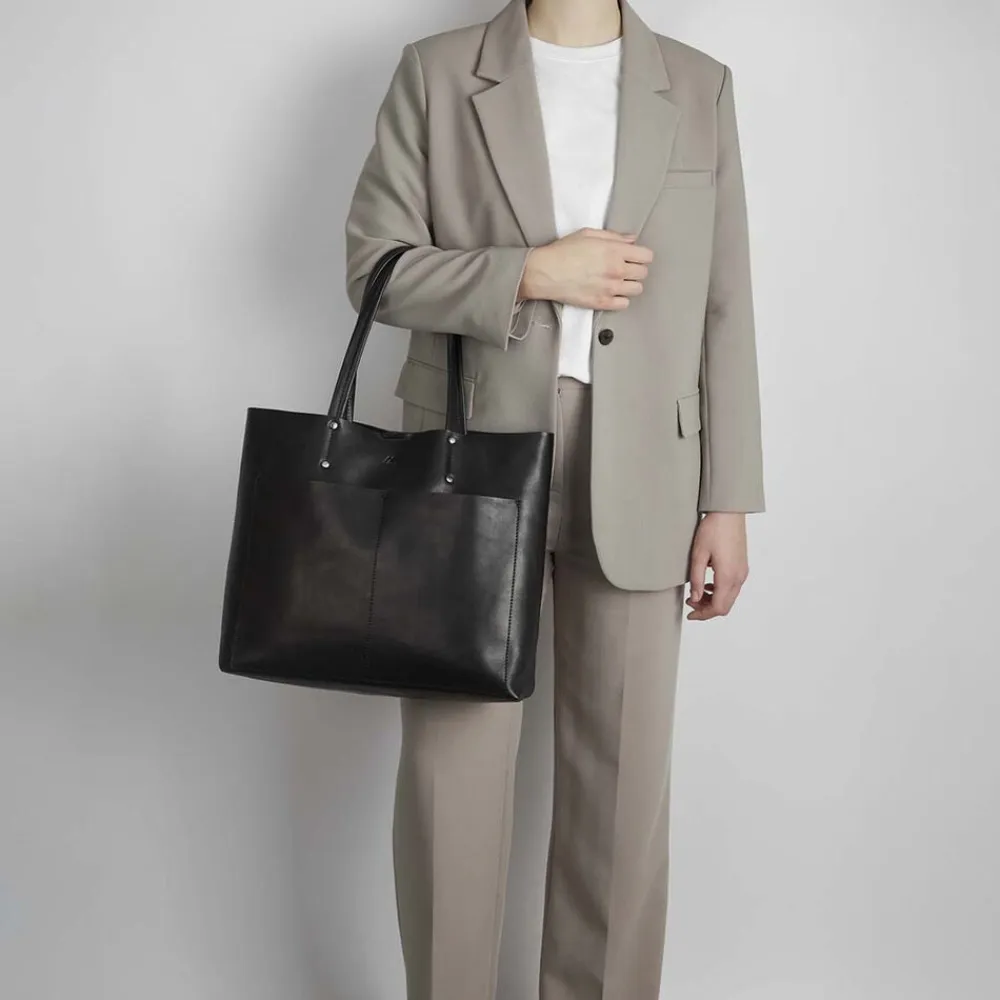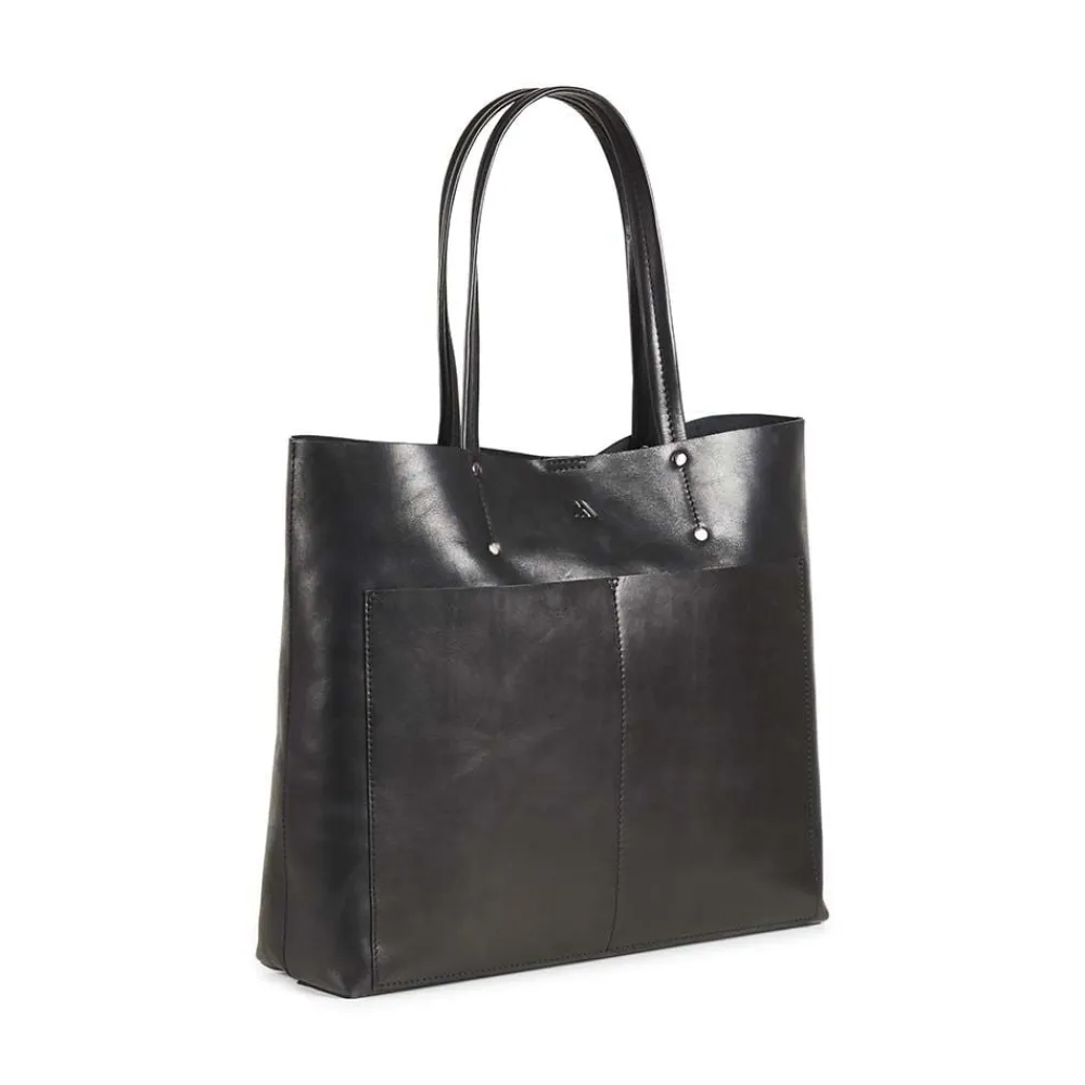 JaydaMBG Shopper fra Markberg. Tasken er i vegetabilsk indfarvet læder, baseret på naturlige materialer. Lækker taske med to lommer på fronten. Tasken har lynlåslomme indvendig og lukkes med magnet. To skulder hanke. Ingen indvendig for.