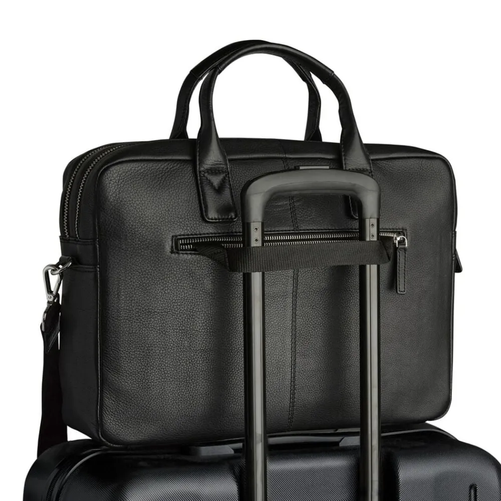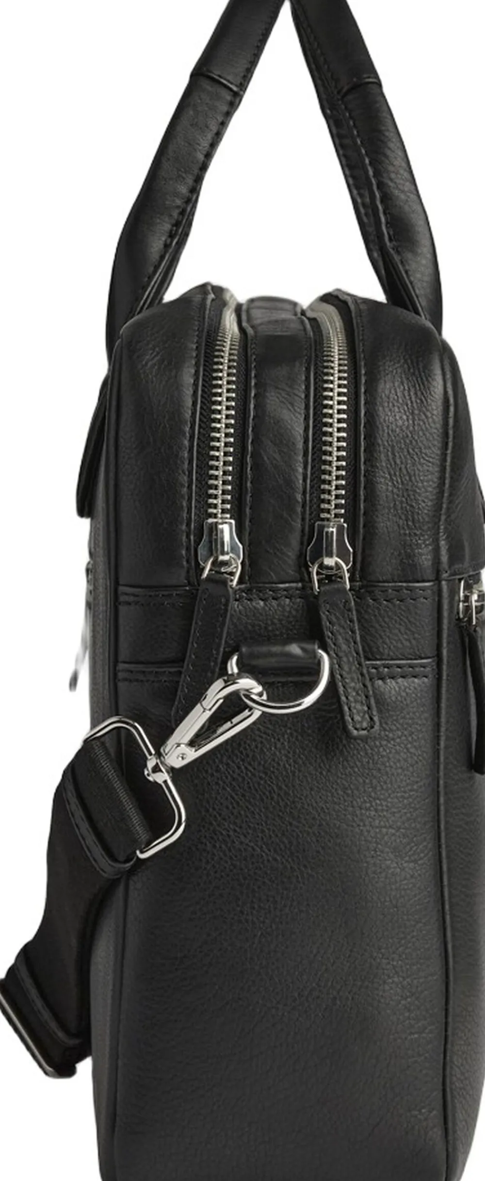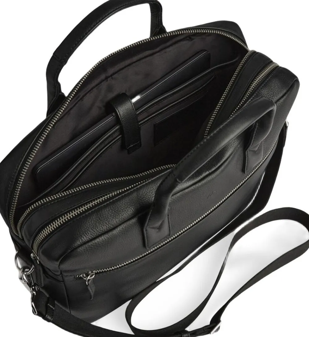 Kingston Laptop Bag fra Markberg Man, er en elegant og funktionel computertaske i 100% kalveskind, med et tidløst og maskulint udtryk. Kvaliteten er LWG-certificeret og er en del af vores Zero Waste, hvor intet skind går til spilde i produktionen. Læderets struktur og nuance kan variere naturligt og giver tasken et unikt udtryk. Tasken er designet med fokus på kvalitet og brugbarhed ideel til både arbejde og rejser. Udvendigt har tasken en stor lynlås frontlomme, med plads til diverse ejendele. Dertil har den 2 gode hoved rum, der åbnes og lukkes med lynlås. I det første store rum er der på den ene side en åben lomme, samt 2 rum til kuglepinde og en lynlåslommeover. I dette hoved rum er der plads til diverse dokumenter og andre ting, du har med på farten. Det bagerste rum er der et polstret rum som åbnes og lykkes med et læderstykke med velcro. Dette er tiltænkt til din 14 computer. Dertil er der ekstra rum med plads til IPads eller en anden tablet. Bagpå tasken er der en lynlåslomme, hvor der er en luggage strap du kan tage frem, men til fastgørelse på din kuffert, når du er ude og rejse. Tasken har en bred justerbar og aftagelig skulderrem. Dertil har tasken også to bærehanke, og taskens slidstærke for er i 100% polyester. Taskens hardware er i metal, som er belagt og så er det nikkelfri. Tasken måler 29 cm x 41 cm x 11 cm.