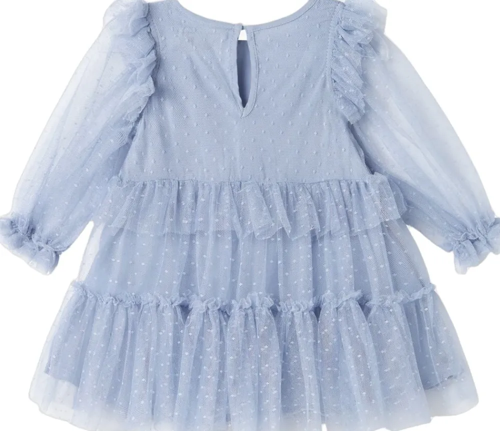 Langærmet kjole til de mindste med masser af volumen og flotte tylflæser. Kjolen er pyntet med prikker og har knaplukning bagpå. Kjolens længde går til over knæet.