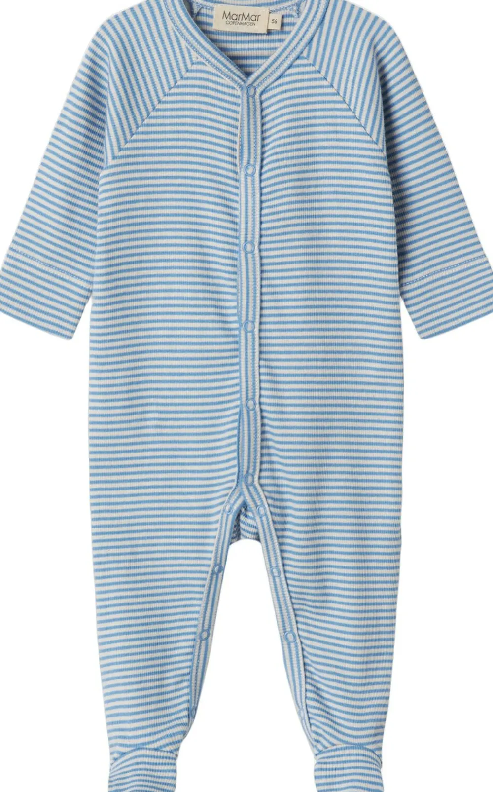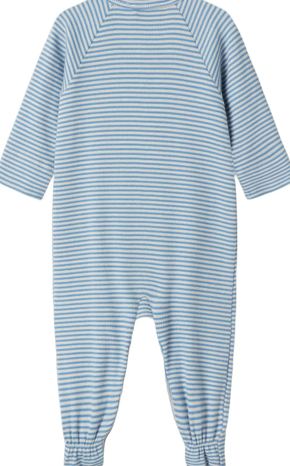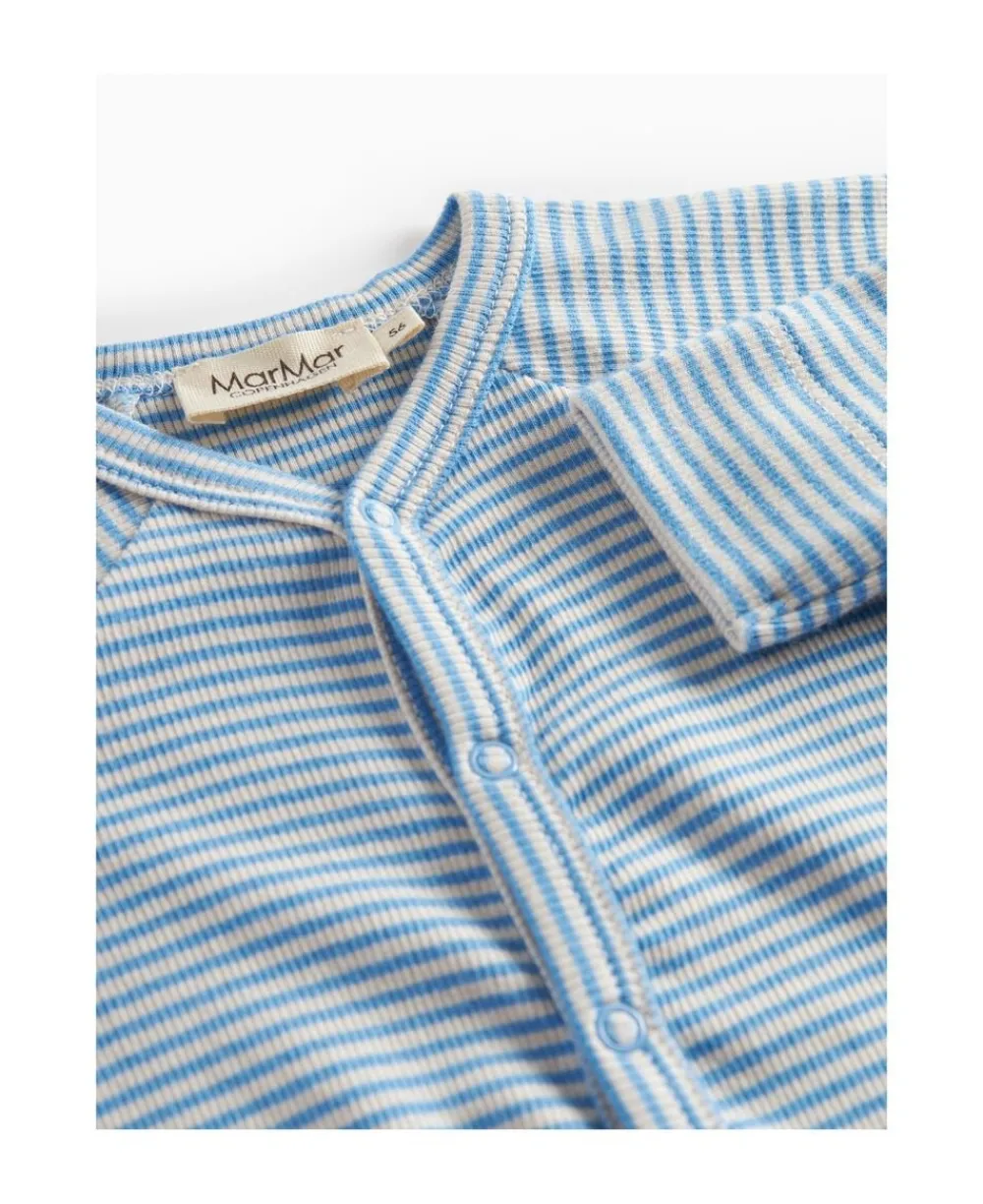 Enkel langærmet heldragt med fødder og fine striber, der kan knappes helt fra hals og ned langs begge ben med trykknapper for nem bleskiftning. Heldragten er både blød, holder form og farve og har elastan i sig som gør den strækbar og behagelig at have på.