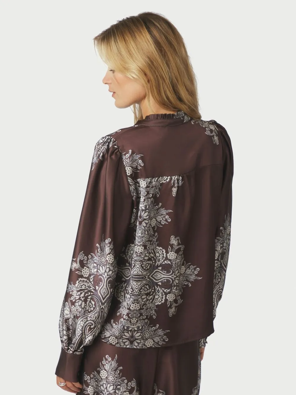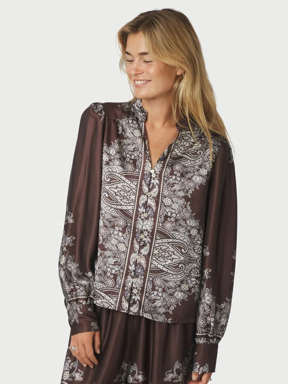 Langærmet bluse med paisley print. Blusen har en v-halsudskæring med en lille flæsekrave, puffede ærmer med tætsiddende manchetter og lukkes med dekorative knapper langs fronten. Den har en almindelig pasform. Modellen er iført størrelse 36.