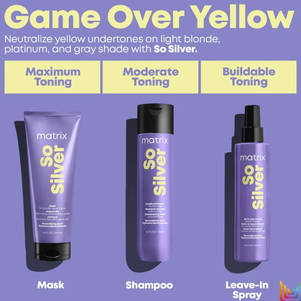Sådan gør du: Anvendelse: Spray produktet på håndklædetørt hår, red gennem, og style som vanligt. Brug så ofte som muligt for at vedligeholde kølige undertoner. Brug alene eller efter So Silver-shampoo eller -balsam. Skyl straks med rigeligt vand ved kontakt med øjnene. So Silver All-In-One Toning Leave-In Spray er til let toning og næring. For maksimal toning, vask med So Silver-shampoo, plej med So Silver-balsam og påfør så So Silver All-In-One Toning Leave-In Spray.