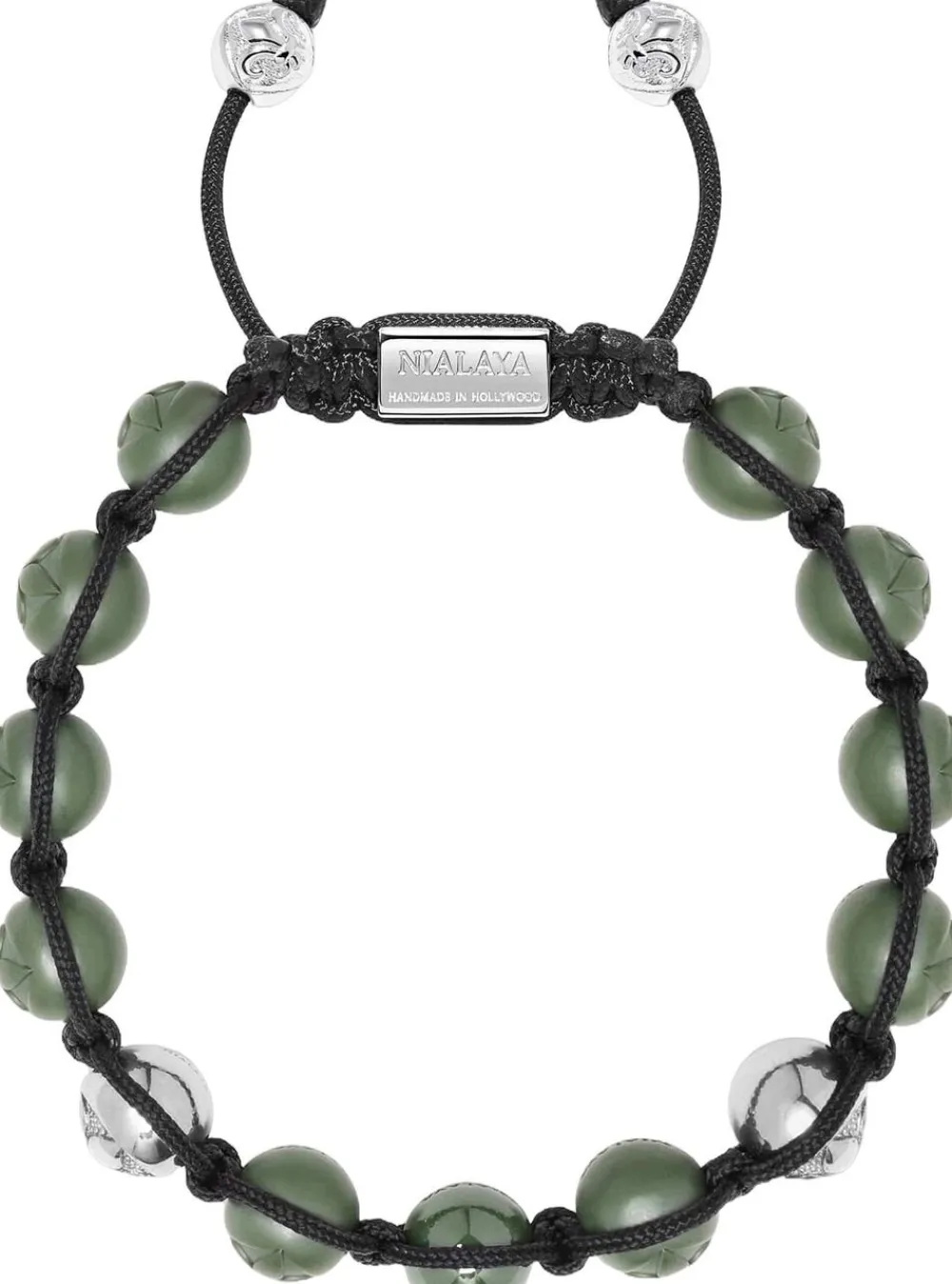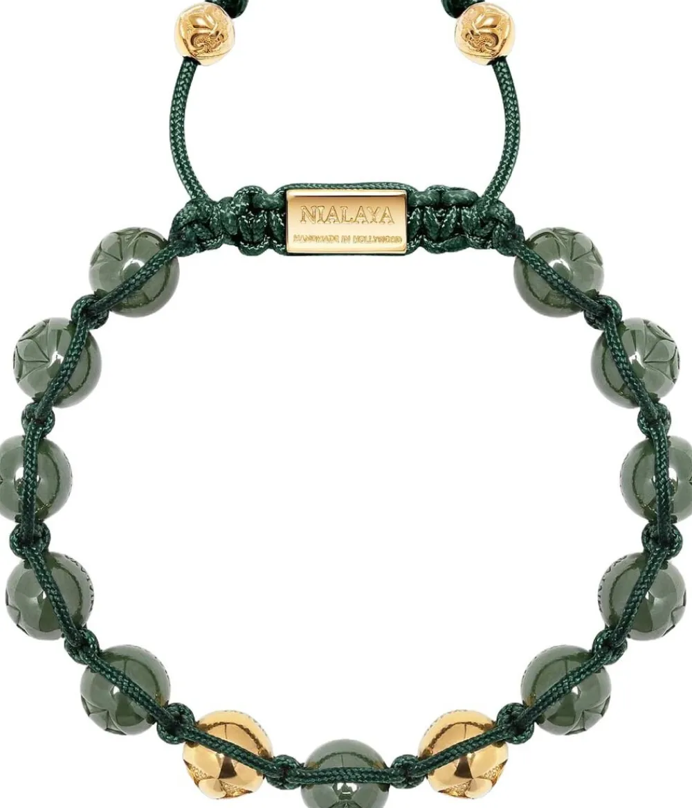 Beaded-armbånd til Herre med 10MM blank grøn keramik og guldperler, 18.000 guld og 316L rustfrit stål, vand, varme, svedresistent, ingen misfarvning eller tandfarvning og allergivenlig. Håndlavet i Los Angeles