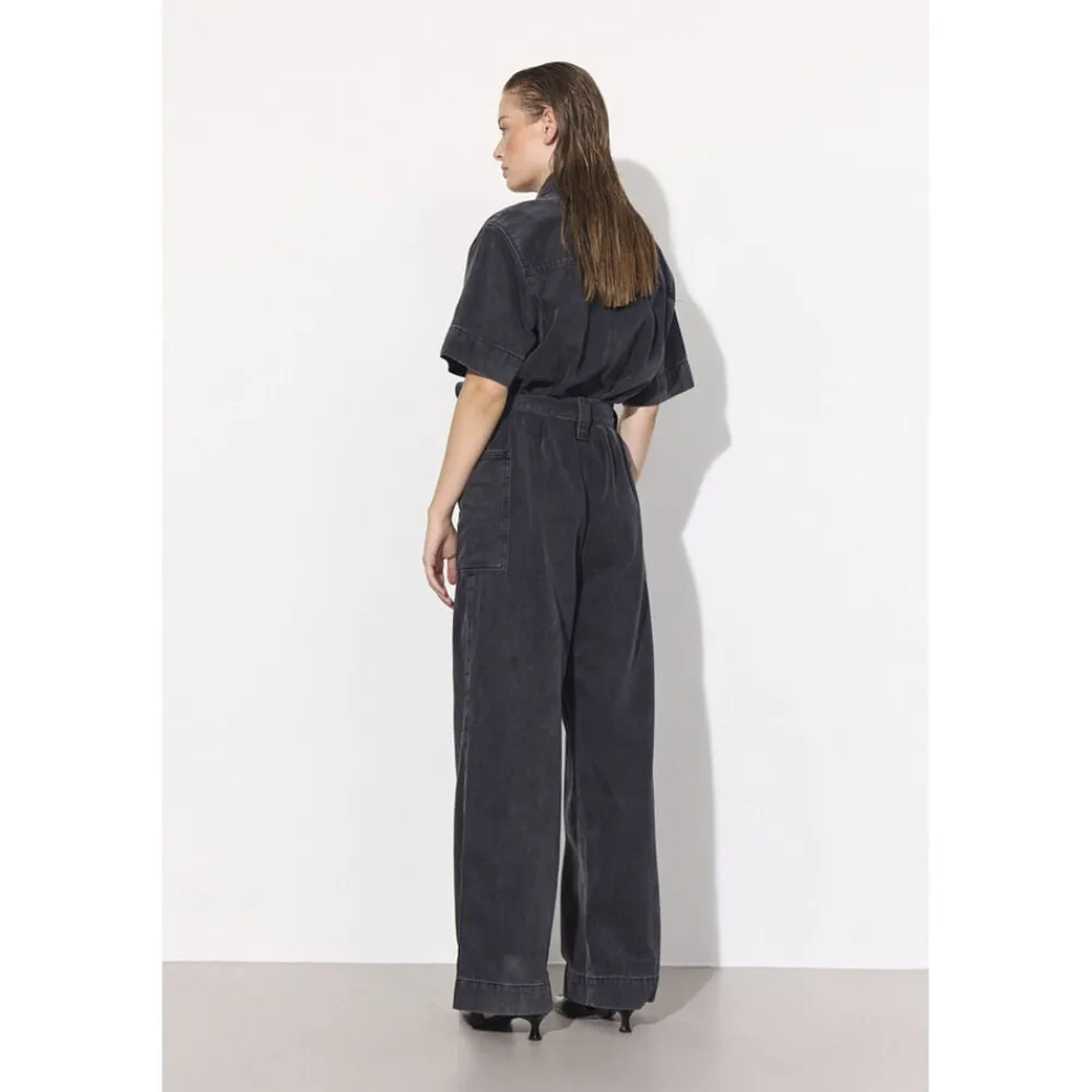 – Praktisk design: Jumpsuiten har en klassisk krave og knaplukning, der giver et tidløst look, samtidig med at den er nem at tage af og på.