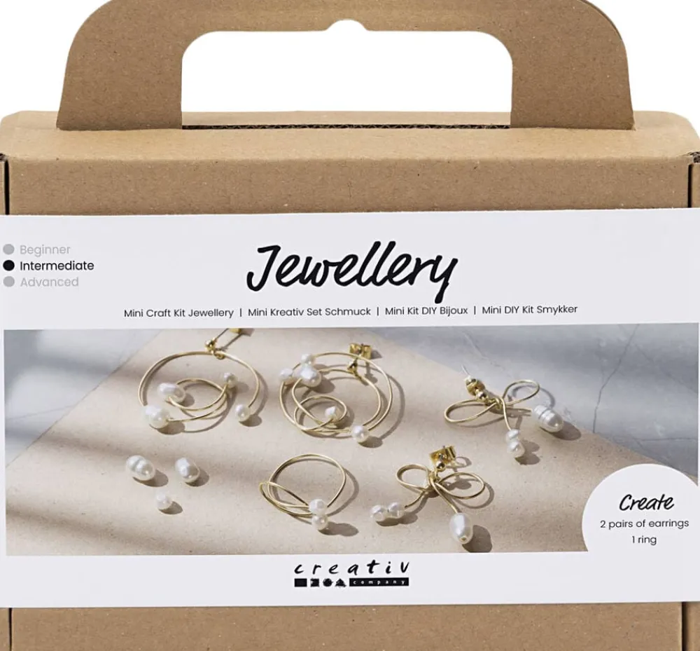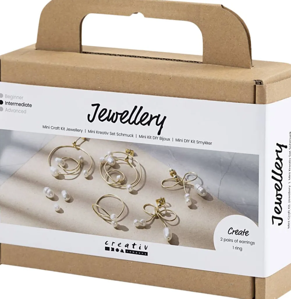 Med dette kit kan du lave smykker ud af smykkewire og perler. Skab trendy øreringe både spiraler og sløjfer samt en unik fingerring. Indeholder alle de materialer du skal bruge, og al den vejledning du behøver. Er du altid med på den sidste nye smykkemode, så er dette kit lige noget for dig. Med kittet kan du skabe elegante smykker med masser af wauw-effekt. Du former smykkerne af forgyldt smykkewire, og tilføjer enkle perlemors voksperler som pynt. Lav to sæt øreringe et par flotte spiral øreringe og et par søde sløjfe øreringe. Du kan også kreere din helt egen ring i samme stil.