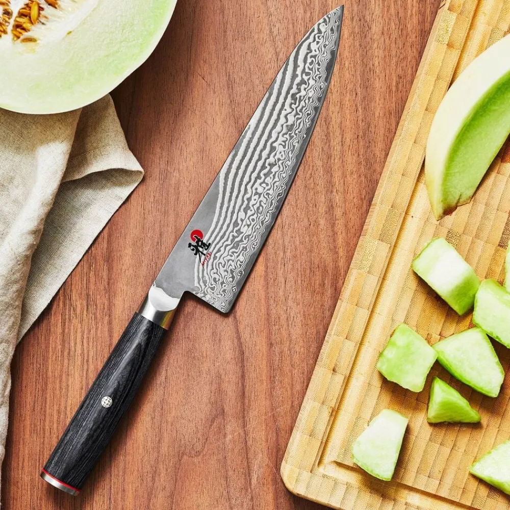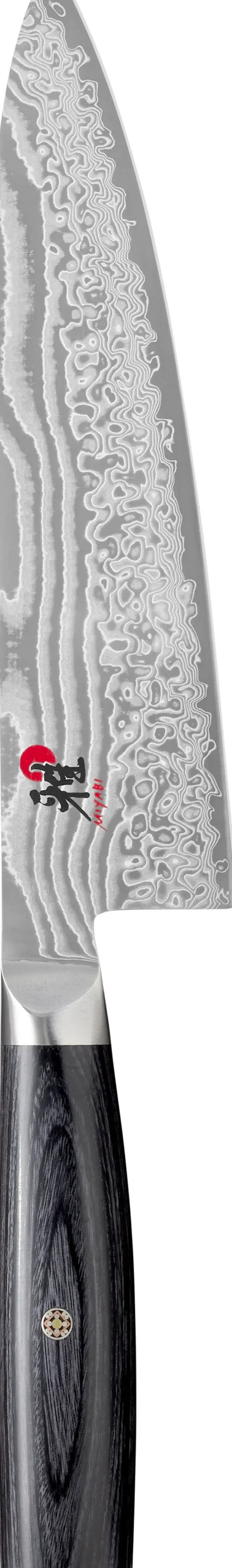 Miyabi 5000 FCD serien er en symbiose af elegant design, den nyeste teknologi og århundredes erfaring med fremstilling af knive. Det smukke knivblad skiller sig ud med sine 48 lag damask stål, og en kerne af FC61 stål, med en hårdhed på 61 Rockwell og en ultra skarp Honbazuke slibning, sikrer at alle skæreopgaver i køkkenet udføres med lethed. Honbazuke slibningen stammer fra traditionel japansk knivfremstilling – hvert knivblad slibes og poleres af 3 omgange, alle med håndkraft. Knivstålets fulde potentiale opnås ved is-hærdning FRIODUR® hærdningsprocessen sikrer ekstrem hårdhed, skarphed, slidstyrke og korrosionsbestandighed. Kvag det høje Rockwelltal vedligeholdes og slibes knivene på en slibesten, en keramisk slibestav eller med Miyabi knivskærperen. Det sorte skaft af Pakka-træ er perfekt afbalanceret og ergonomisk, således arbejdet med kniven forbliver en fornøjelse. Serien består af 9 forskellige knive.