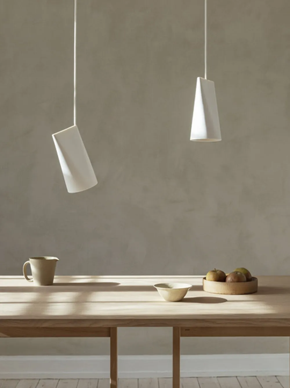 Vedhænget er efterladt uglaseret, råt og brændt ved over 1100 °C, hvilket giver en overflade, der er mat og fint tekstureret. Skyggen er håndlavet, og derfor varierer hver lampe lidt i form, størrelse og farve, hvilket gør hver pendel unik.