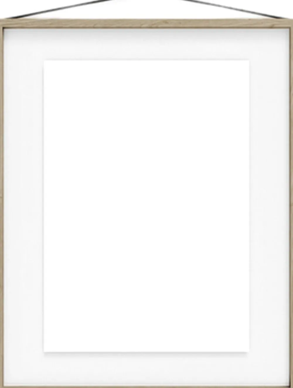 Frame consists of two pieces of acrylic glass, four lists, and a rubber band. The rubber band both holds the frame together and serves for hanging the frame on your wall. The simple but clever construction allows the frame to be hung in either direction or even to be viewed from both sides, giving your artworks or photographs the focus they deserve. Choose from ten different finishes and six different sizes (40×50 cm & 50×70 cm available only in oak & black).