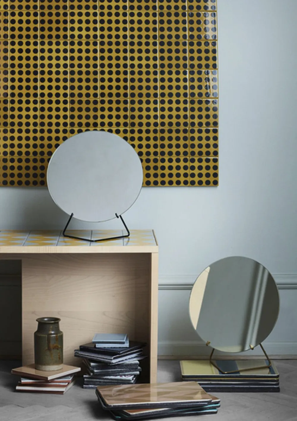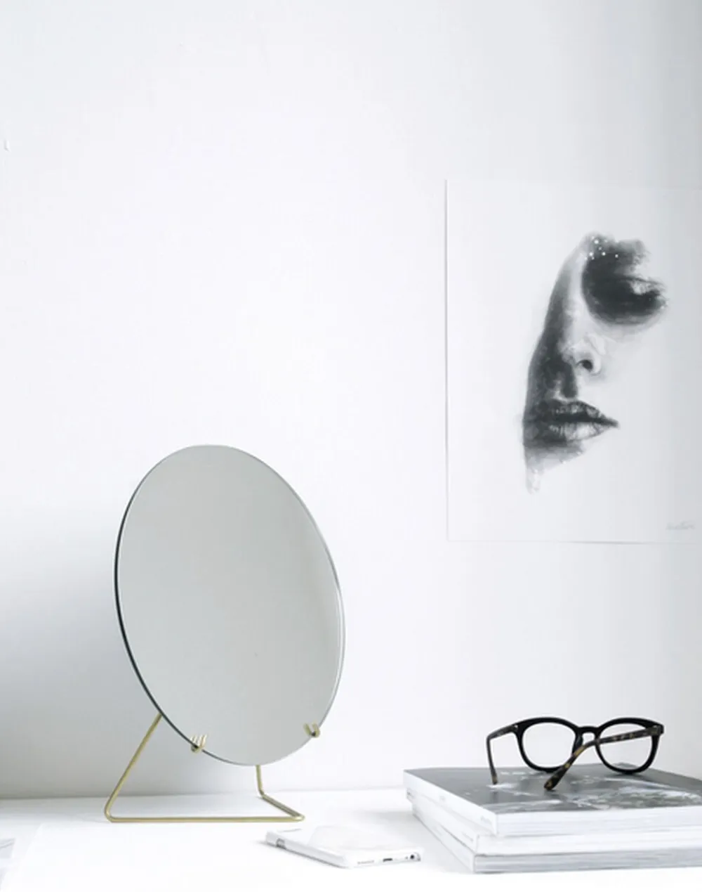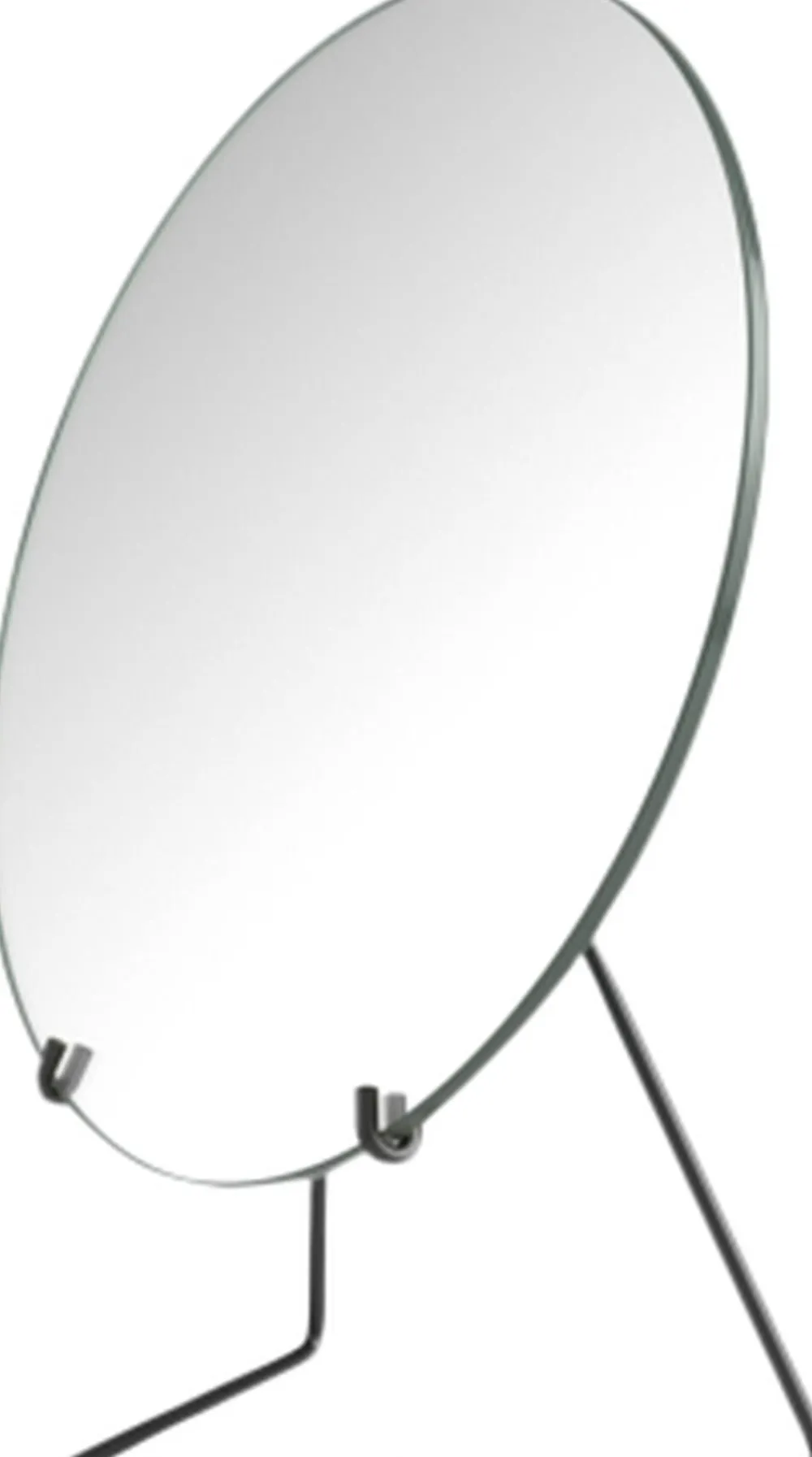 STANDING MIRROR er et rammeløst bordspejl holdt af en let wireform. Kontrasten mellem de to komponenters egenskaber – let og massiv – er det der giver designet karakter.