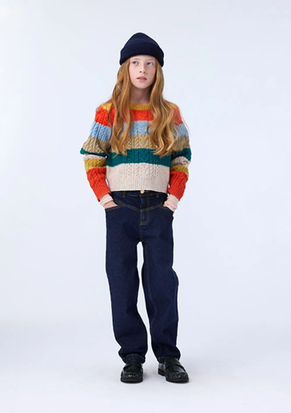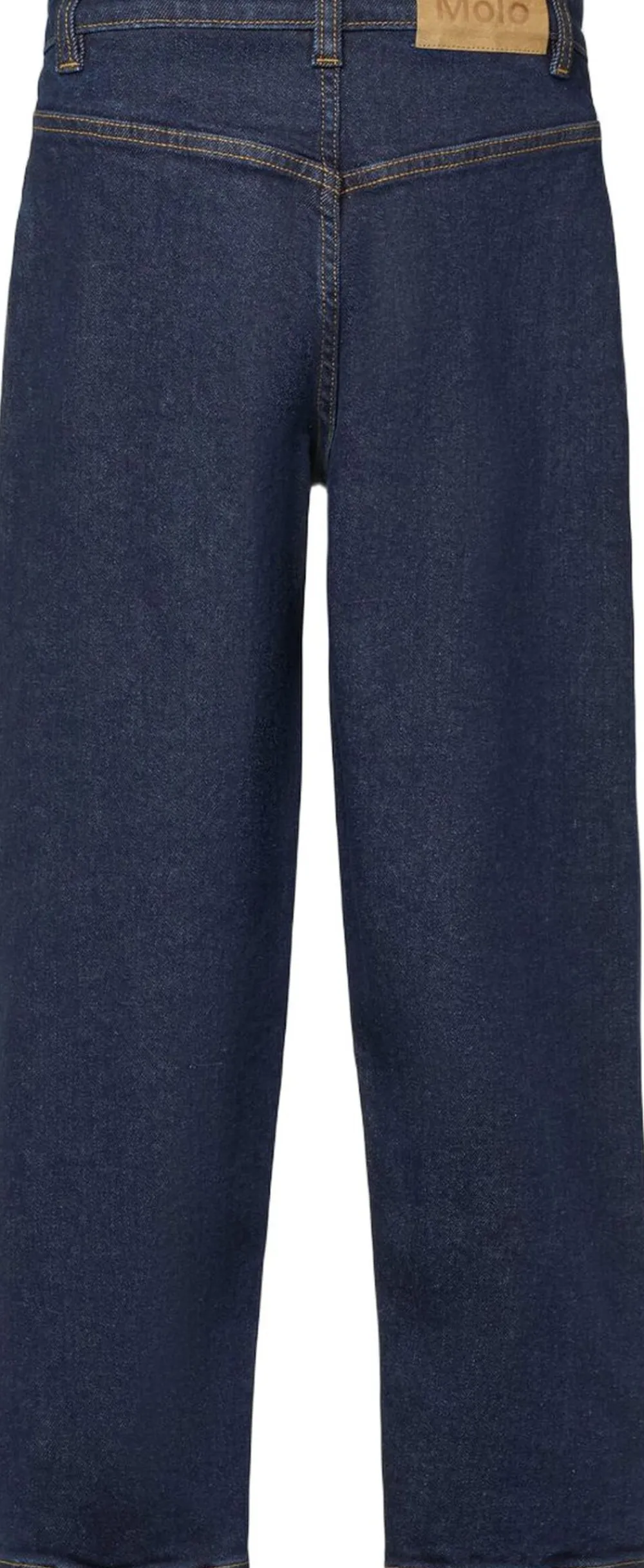 Disse mørkeblå denimjeans fra Molo er lavet af økologisk bomuld med kobberfarvede stikninger. Jeansene har en normal pasform, stikninger foran og to forlommer. Livvidden kan justeres med en indvendig elastik for optimal pasform til alle børn. Størrelser 92-134 har trykknap, mens størrelser 140-176 har en almindelig jeansknap.