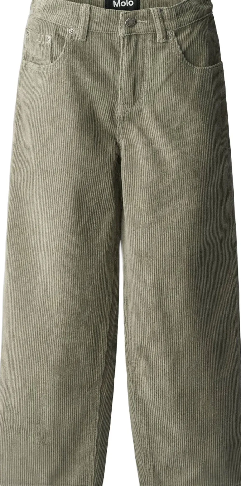 Disse mørkegrønne bukser fra Molo er lavet i riflet fløjl og har fem lommer, brede ben og gylp med lynlås. Inspireret af skatermiljøet har de en afslappet, løs pasform. Livvidden kan justeres med en indvendig elastik for optimal pasform til alle børn. Størrelser 92-134 har trykknap, mens størrelser 140-176 har en almindelig jeansknap.
