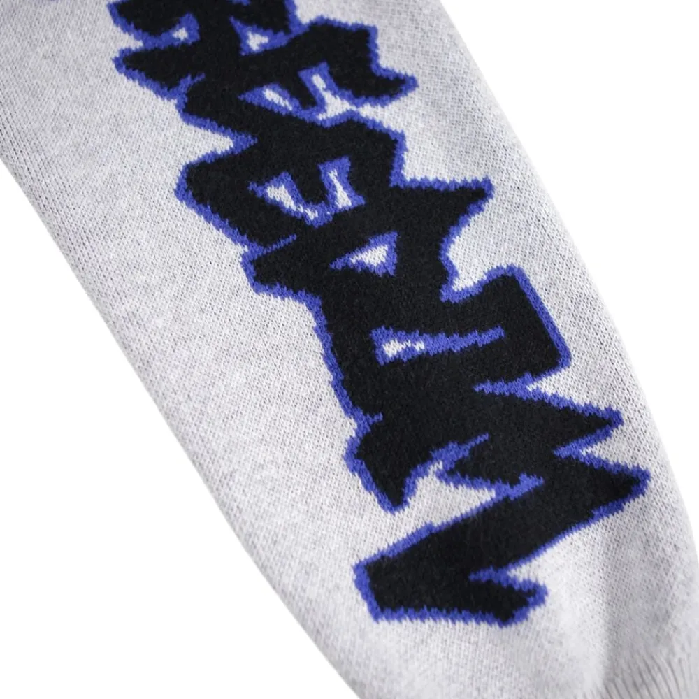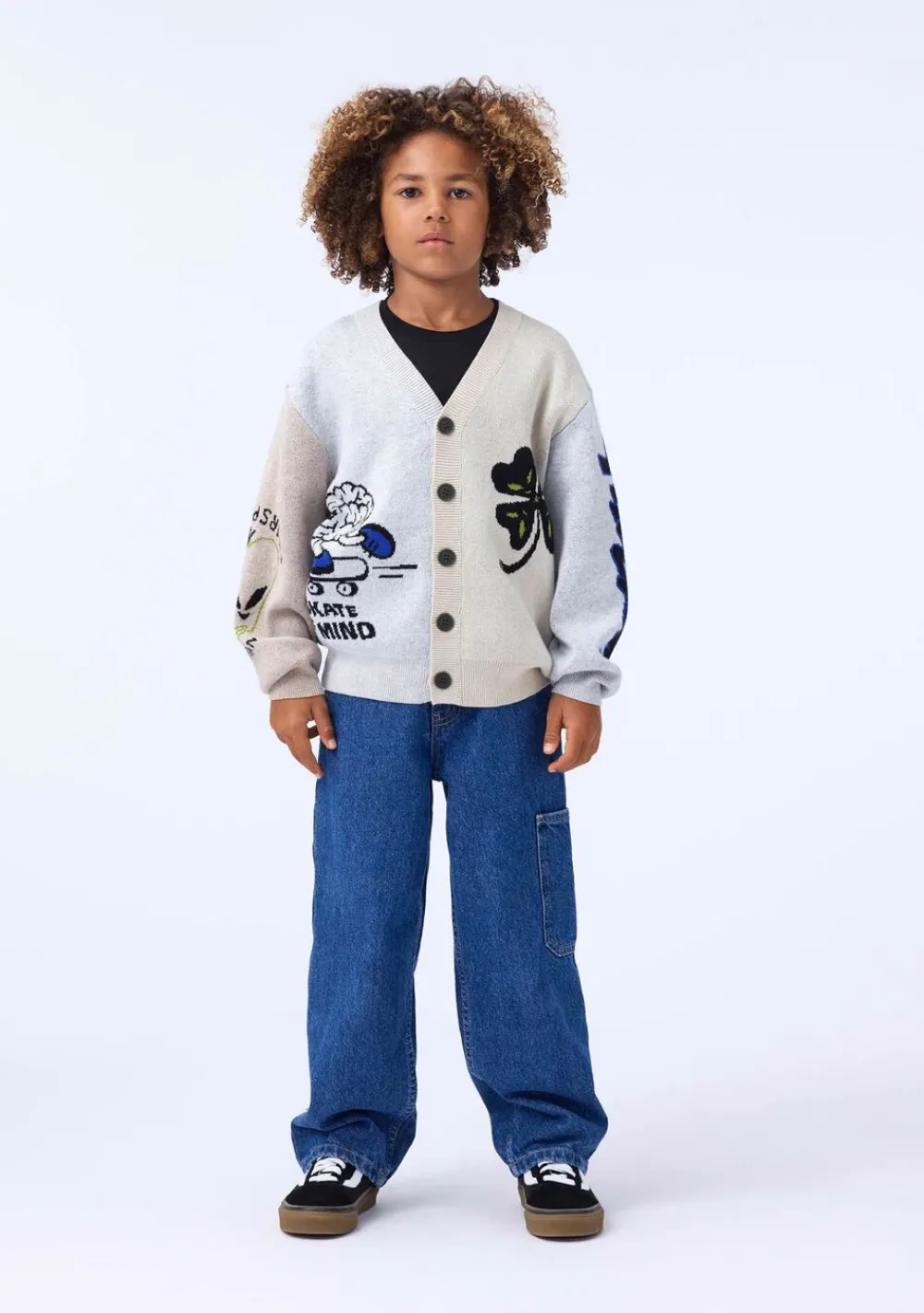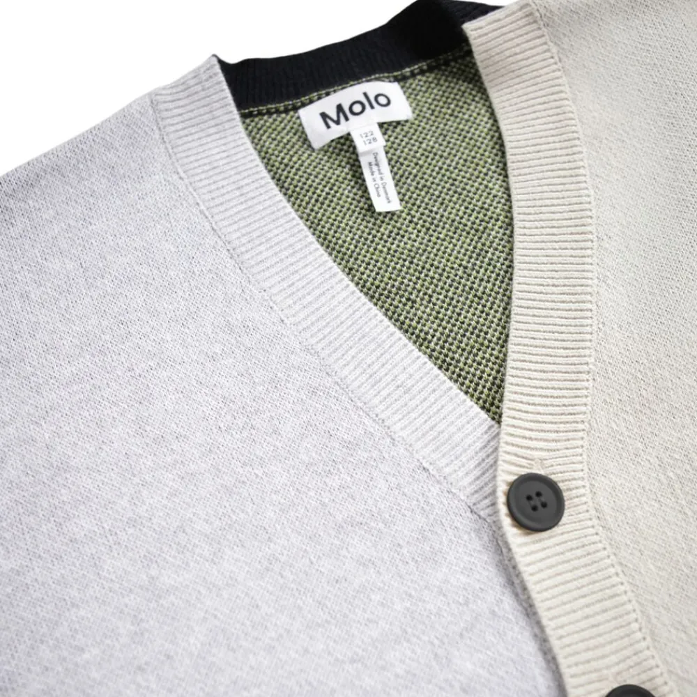 Denne multifarvede strikcardigan fra Molo er lavet i bomuld og uld og har en V-halsudskæring, knapper, ribstolpe og rib ved ærme og hofte. Cardiganen har en almindelig pasform og et mønster af forskellige grafik samt en stor alien bagpå.