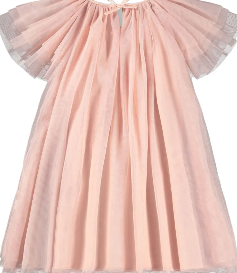 Knælang kjole i let tyl med fine plisseringer, der giver en skøn svaj i bevægelsen. De korte, transparente ærmer og det elegante bindebånd i nakken tilføjer en legende charme. Denne kjole er ideel til festlige anledninger, hvor dit barn vil føle sig både komfortabelt og stilfuldt på samme tid. Perfekt til sommerfester og sjove udendørs aktiviteter.